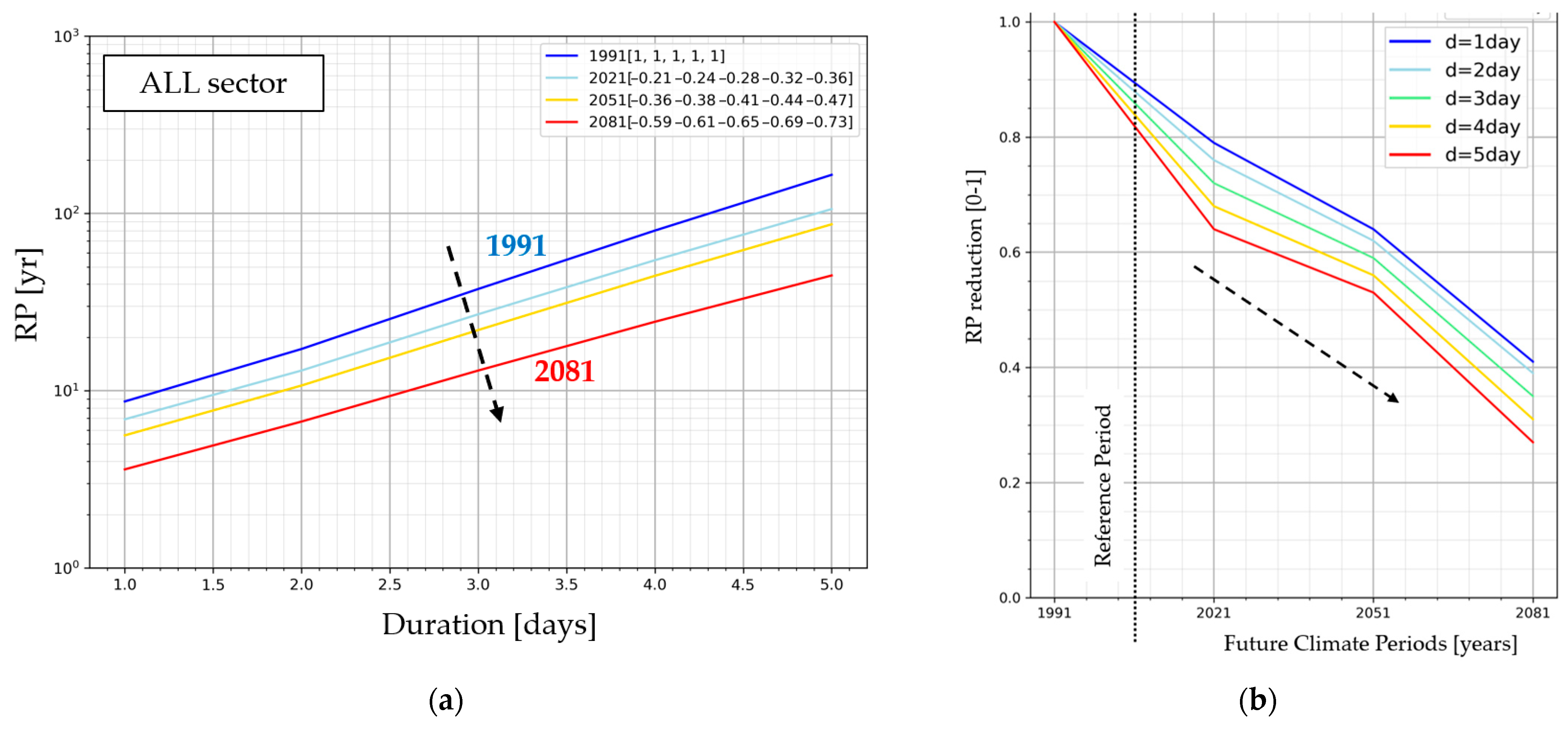 68]. The half-reduction in RP is significant and highlights how climate change impacts the IDF curves. Temperature increasing scales linearly with the rainfall intensity variation (following Clausius-Clapeyron relation), while the logarithm of RP tends to reduce linearly. That means that a linear increase in intensity (i.e. a positive climate anomaly) corresponds to an exponential decrease in RP. This outcome is interesting, especially for hydraulic structure projects and retrofitting that, under a climate change scenario, may be unverified due to RP shifting [