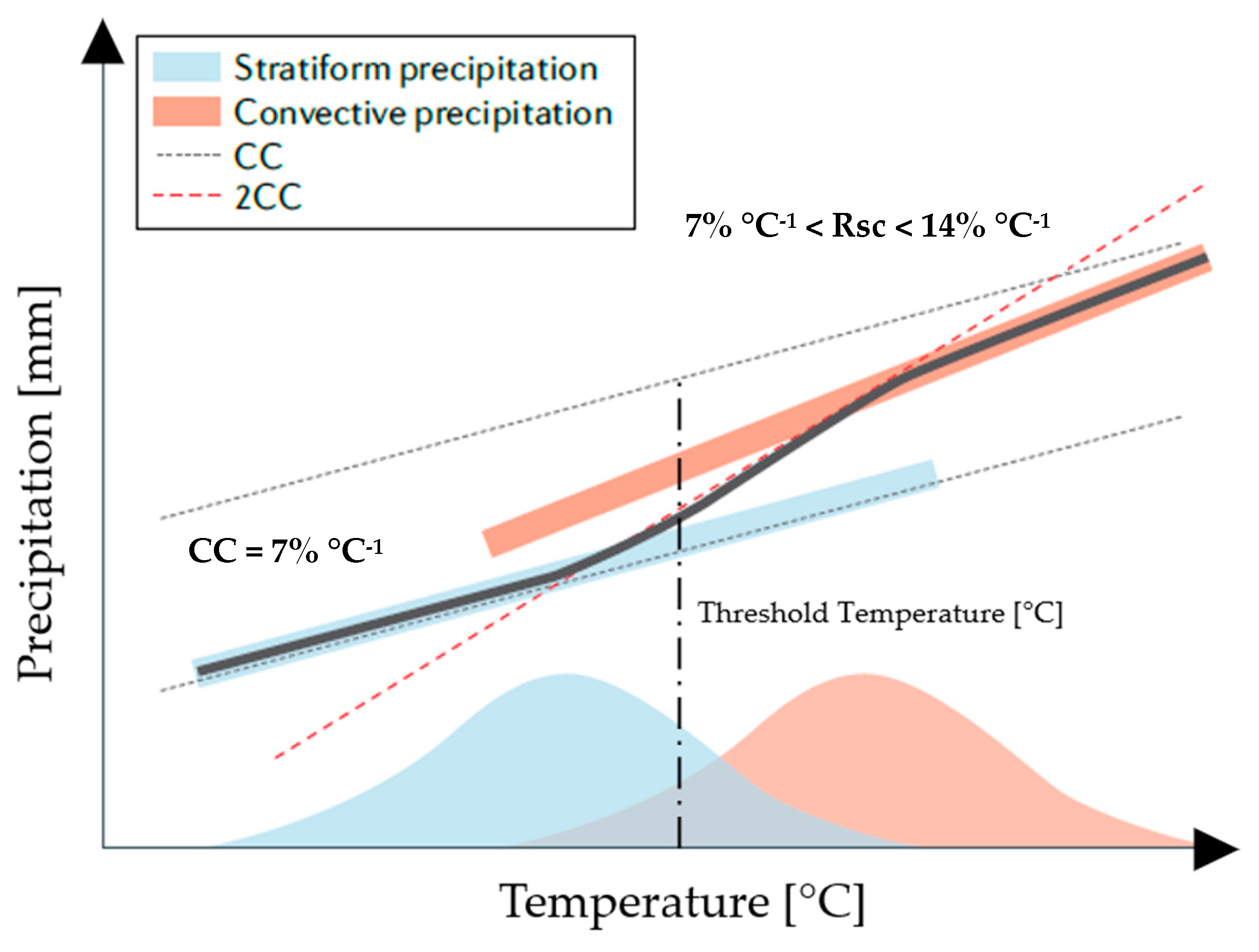 85], the CC value is obtained for stratiform precipitation, while for convective precipitation, it is possible to reach 2CC values. When the precipitation is characterised by a mixed type or with characteristics tending to be convective, an intermediate situation may occur. It should be noted that the linear growth behaviour is, however, limited beyond a certain temperature threshold (~25 °C) [