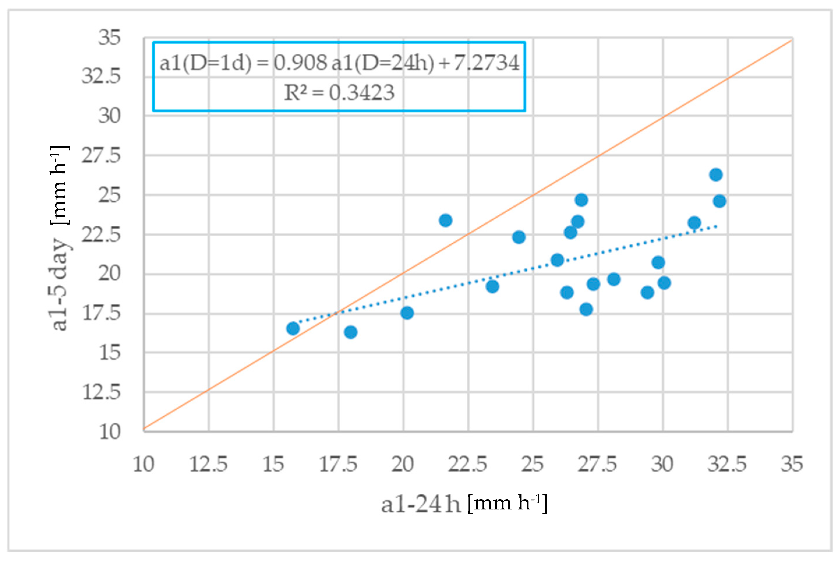 Figure 4, which is the corrected IDF value at D = 24 h or D = 1 day. Probably the most precise and rigorous evaluation is the one coming from the “