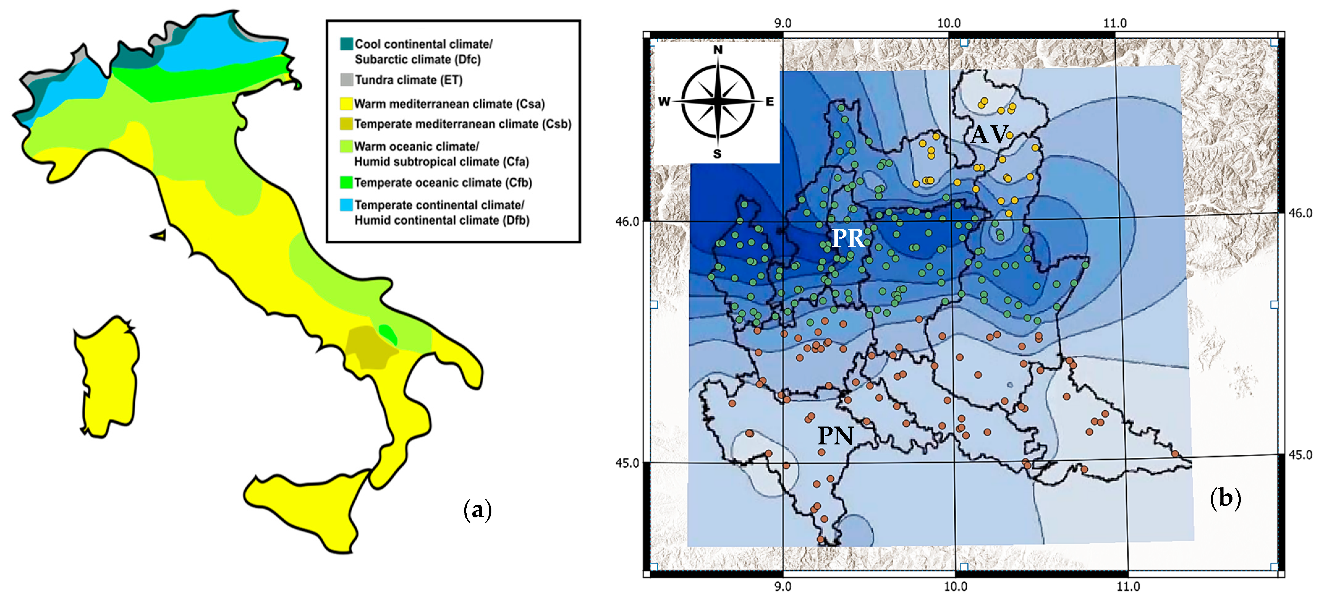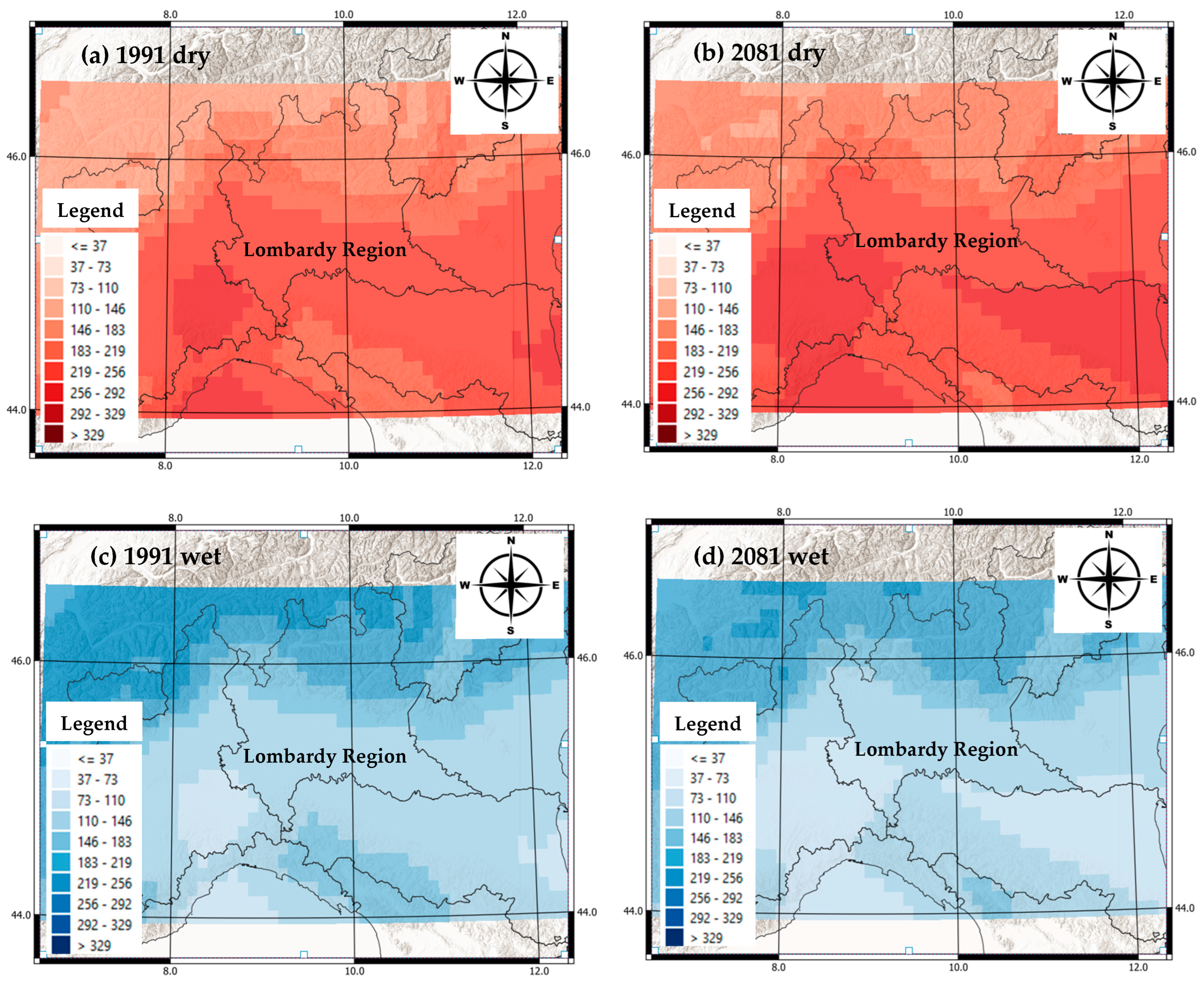 86], an increase in mean temperature is likely to occur in the future, while for precipitation, even if the mean will remain the same, an increase in variance (i.e., more extreme rainfall events) is expected. Our study has addressed this statement across the Lombardy region under the RCP 8.5 scenario, showing the negligible variation in mean precipitation compensated for by an increase in extremes by the end of the current century. These results have been validated statistically through the