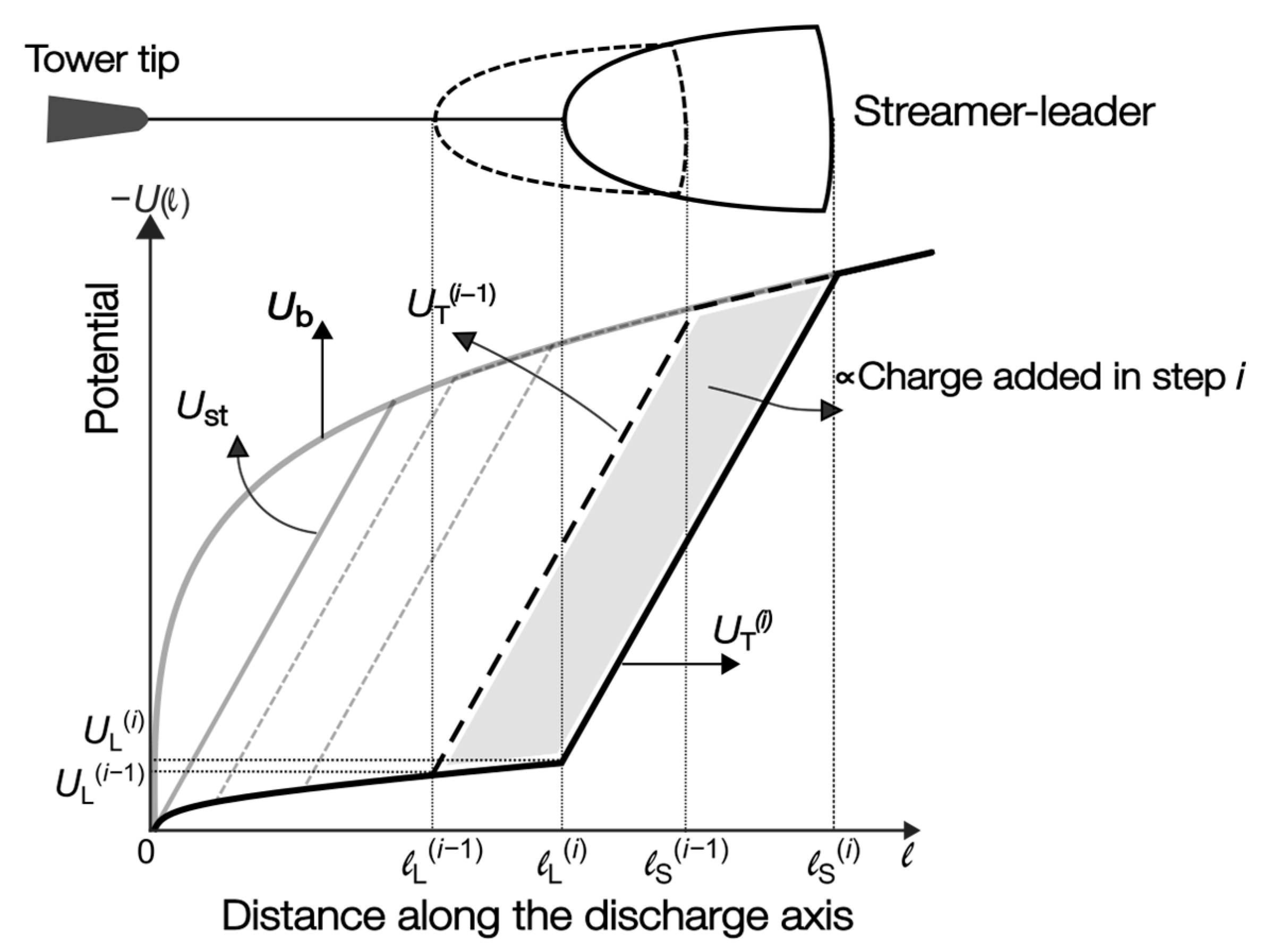 20]. The modeling framework adopted here explicitly incorporates these stages, providing a consistent basis for evaluating inception and propagation conditions of towers exposed to quasi-static thundercloud fields.
