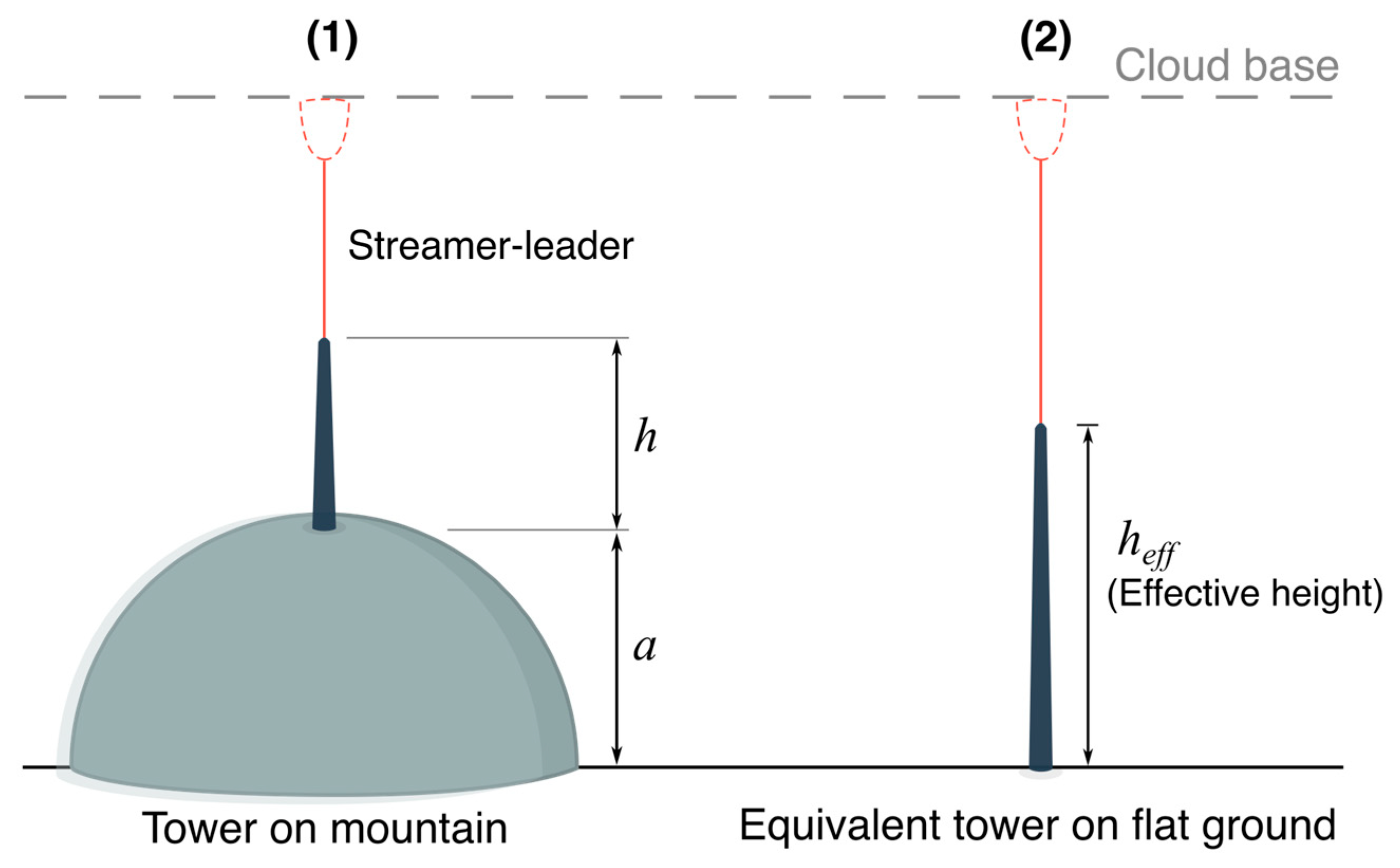 4] derived an analytical expression for the effective height of mountaintop towers by combining Rizk’s inception criterion with geometric scaling of the mountain profile. Their formulation reproduced observed effective heights at several instrumented sites—such as Gaisberg, San Salvatore, and Peissenberg—demonstrating that the analytical approach captured the essential discharge physics under quasi-static thundercloud fields.