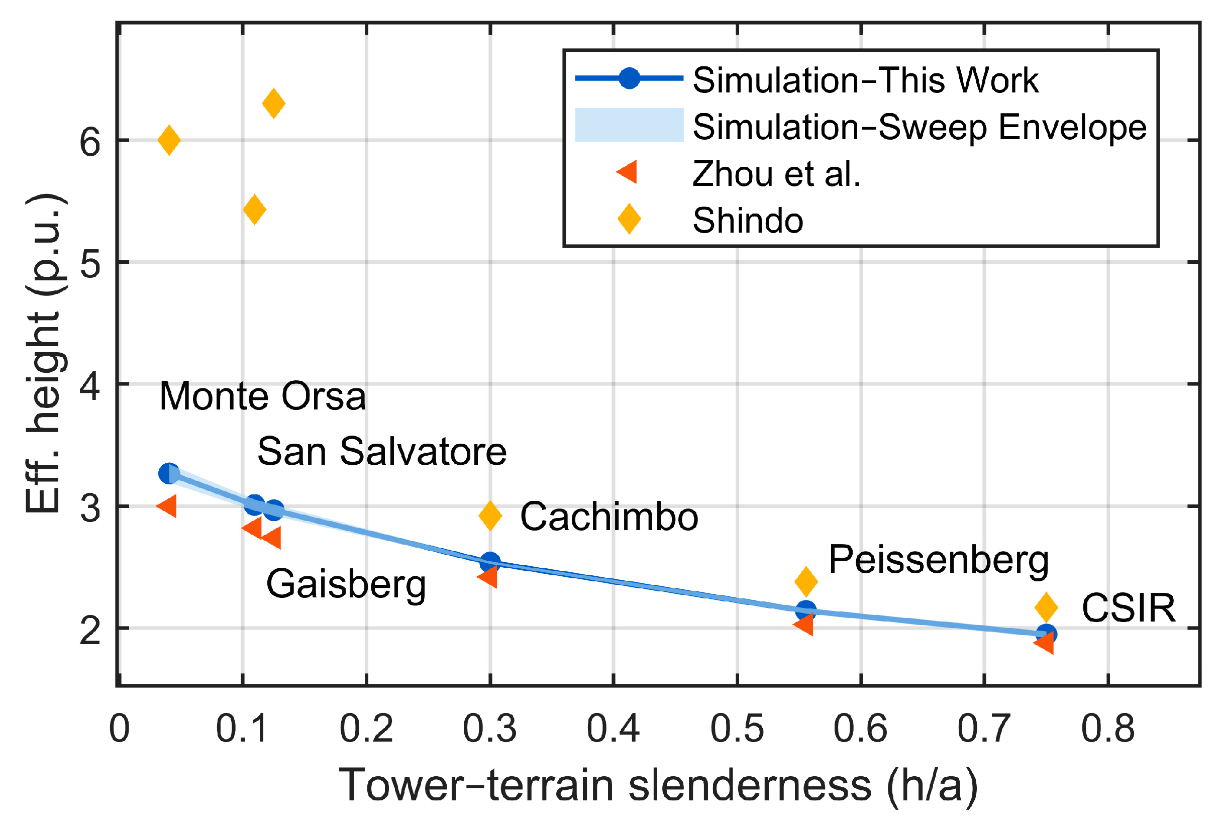 2] show larger deviations, often exceeding 40–70%, reflecting their limited ability to represent detailed tower geometry and terrain curvature. Overall, the framework accurately resolves the geometric dependence of effective height, supporting the physical analyses presented in the following section. The implications of these results and the influence of model assumptions are examined in the following section.