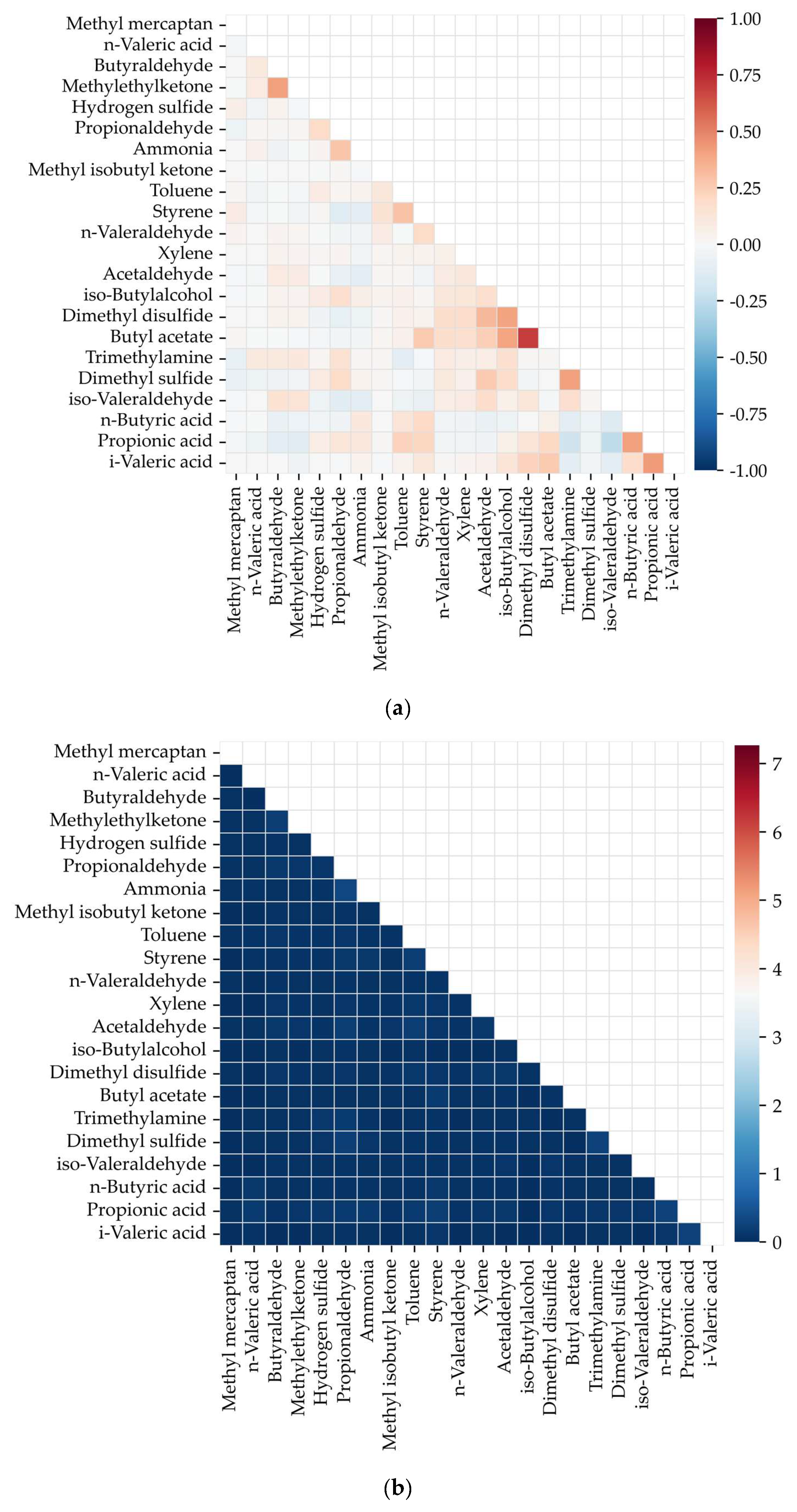 In this study, the correlation structure among 22 designated odorous compounds monitored at a wastewater treatment plant was examined using a multi-dimensional analytical framework. Correlation assessment was conducted sequentially using linear correlation analysis (Pearson), nonlinear and information-theoretic dependence analysis (Mutual Information, MI), and the complementary index MI − |Pearson|, which was introduced to overcome the interpretational limitations of a single correlation metric. Figure 1 presents the resulting correlation matrices visualized as heatmaps for each method.