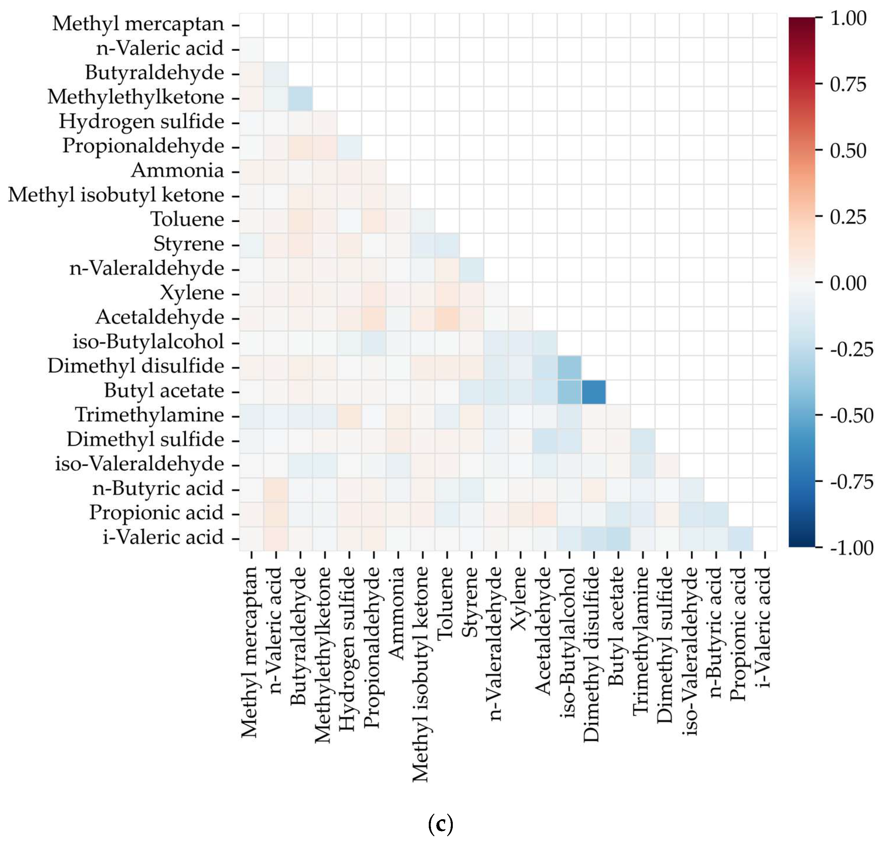 To quantitatively assess the interrelationships among the monitored odor data, Pearson correlation coefficients were calculated for all 22 designated odorous compounds. The time-series concentration data for each compound were first aligned to a common temporal reference with an identical sampling interval, followed by preprocessing steps including missing-value imputation and outlier removal to ensure suitability for statistical analysis. The Pearson correlation coefficient was then computed by normalizing the covariance of each variable pair by their standard deviations, yielding values ranging from −1 to +1.