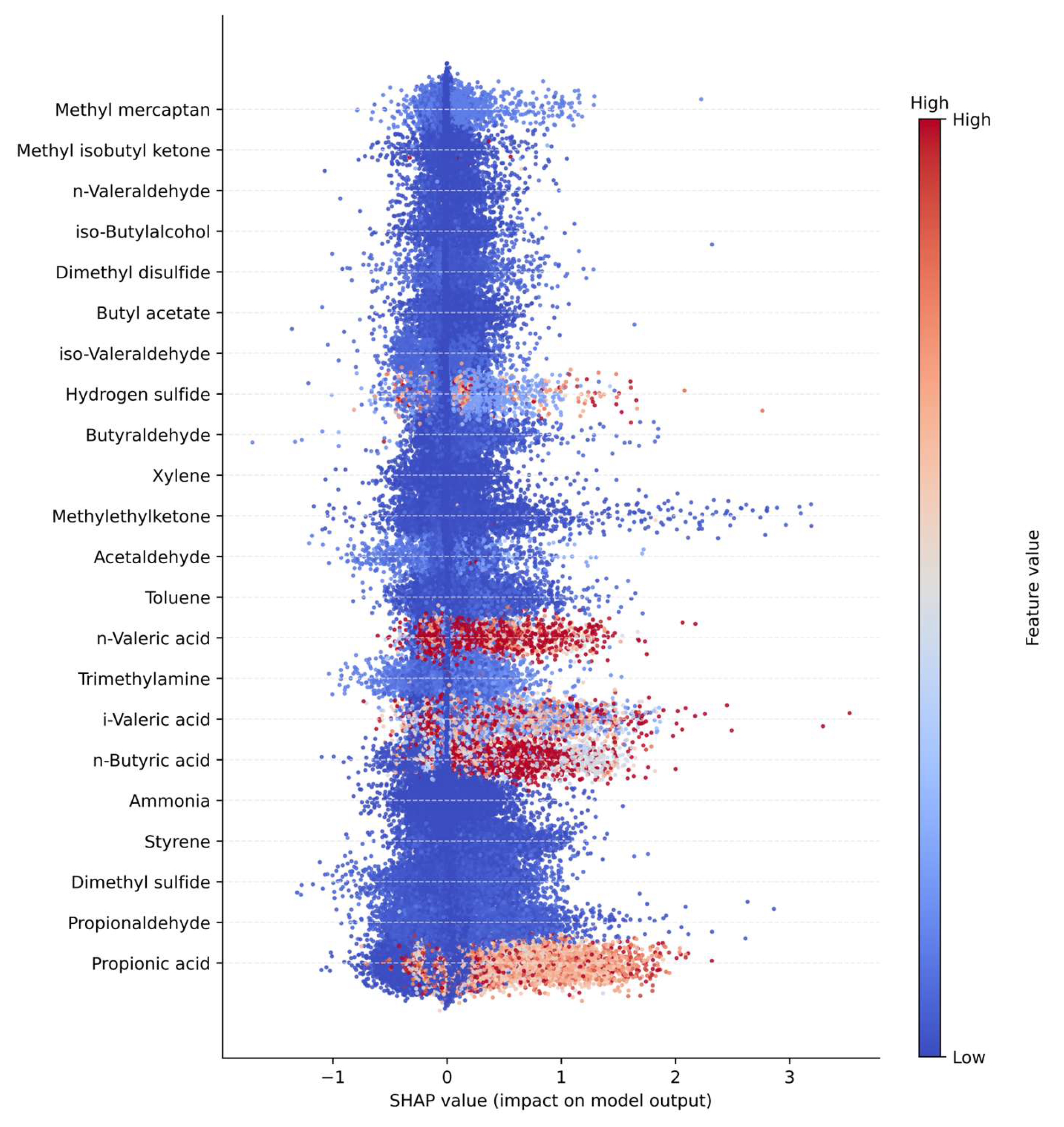 The color distribution of the SHAP summary plot (Feature value) indicates that com-pounds displaying a strong association between high concentration ranges (red) and positive SHAP values contribute directly to odor intensity. Propionaldehyde and n-butyric acid exhibited wide SHAP value ranges (approximately ±400), implying high model sensitivity to variations in their input values.
