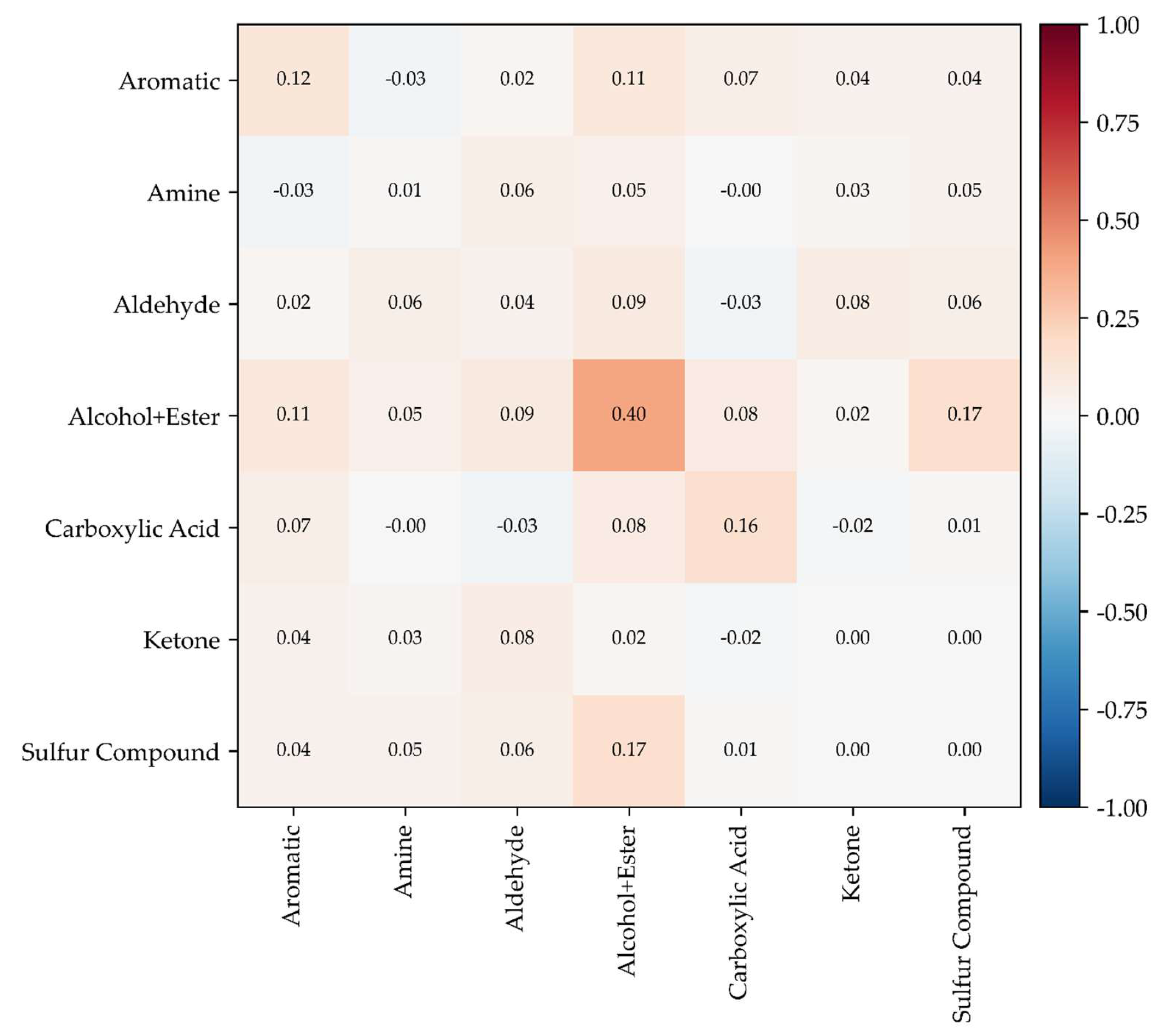 The 22 odorous compounds were classified into seven clusters according to their chemical functional groups: Aromatic compounds, Amines, Aldehydes, Alcohols/Esters, Carboxylic acids, Ketones, and Sulfur compounds. Each cluster consisted of compounds sharing a dominant functional moiety. Based on this classification scheme, the inter- and intra-cluster correlation structure was evaluated using the Pearson correlation matrix (Figure 4 and Table 4).