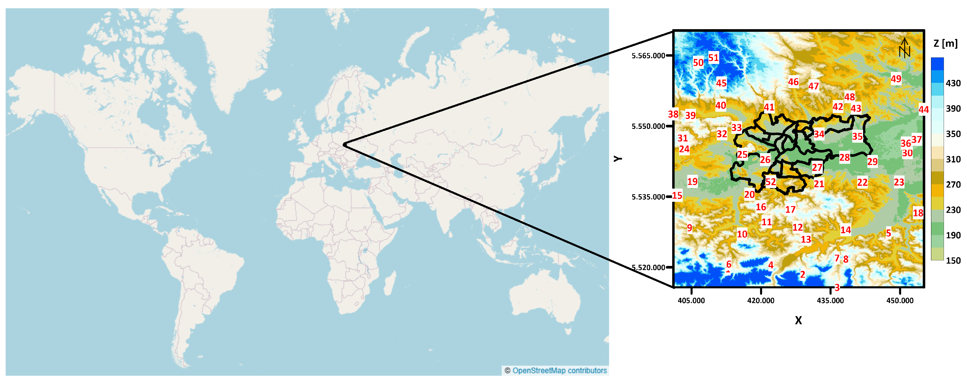 - European Environment Agency (EEA). Copernicus Land Monitoring Service 2022—Digital Terrain Model (EU-DEM). 2022. European Union, Copernicus Land Monitoring Service, European Environment Agency (EEA). Available online: https://land.copernicus.eu/imagery-in-situ/eu-dem (accessed on 1 November 2025).