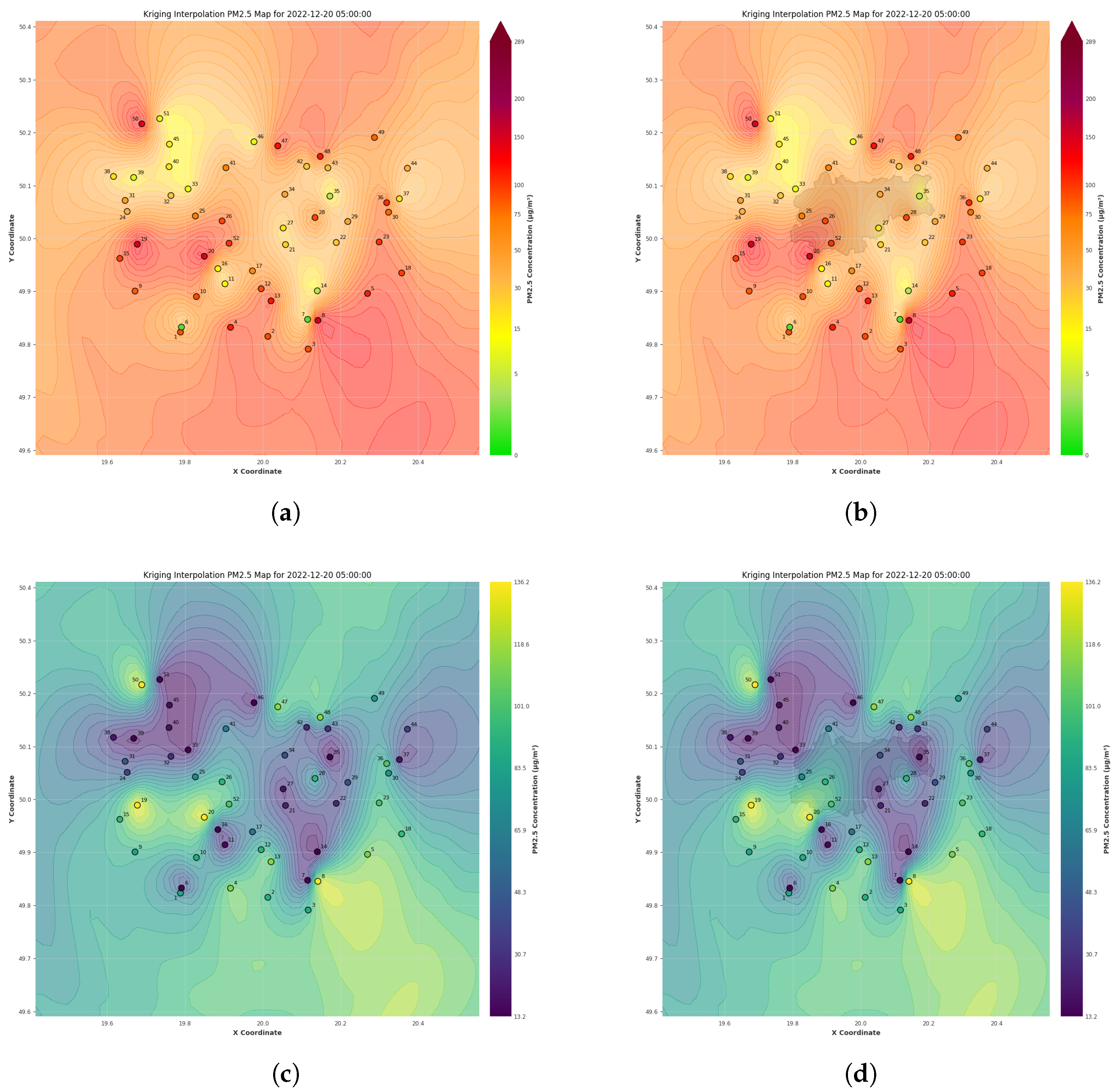 - Recognition of spatial gradients—interpreting gradual attenuation or intensification of PM2.5 concentrations and identifying the general direction of dispersion;