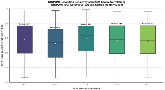TROPOMI resolution sensitivity analysis to determine the optimal grid size for comparison with ground-station data. The box plots show the city-grouped spatial correlation (R) between TROPOMI NO2 total columns and ground-station monthly means (using January 2024 data) at five different TROPOMI L3 grid resolutions (0.05° to 0.25°). The central line represents the median, the white diamond indicates the mean, the box limits indicate the 25th and 75th percentiles (Interquartile Range), and the whiskers extend to 1.5 times the IQR.