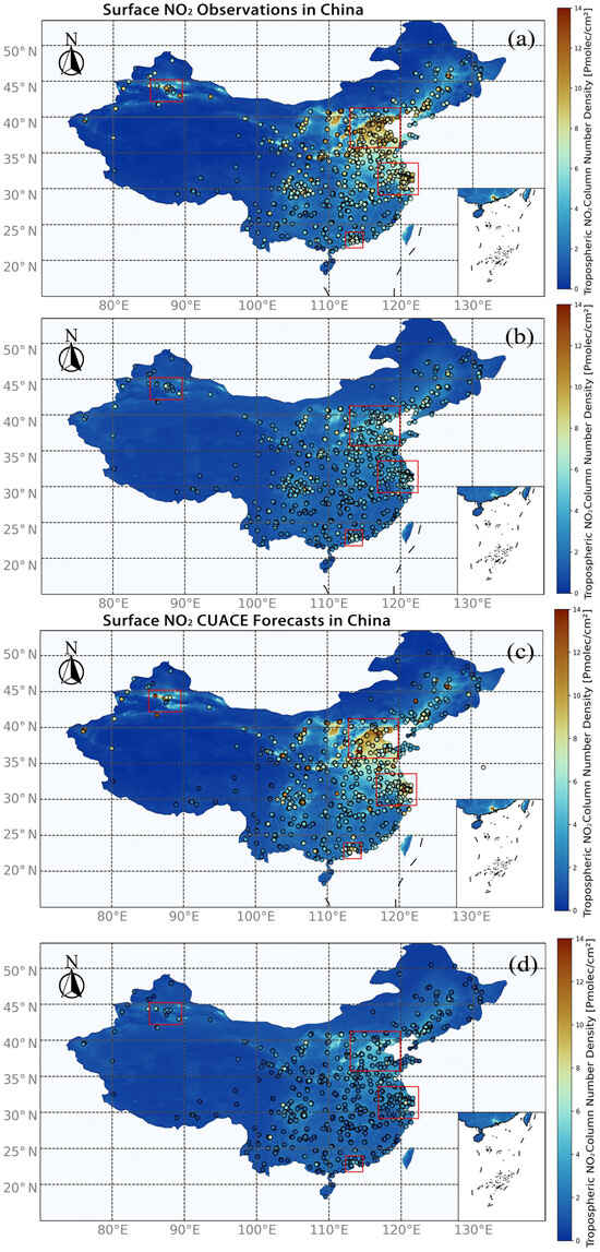 While monitoring is vital, numerical forecasting remains central to China’s environmental protection strategy for proactive emission control. The CMA-CUACE/Haze-Fog V3.0, operational since November 2022, represents a significant upgrade featuring a refined 9 km resolution and improved physicochemical mechanisms, specifically including new heterogeneous reactions for secondary aerosols [13]. A critical innovation in this system (developed by Li et al., 2023 [14]) is the integration of dynamic data correction techniques, via an Ensemble Optimal Interpolation (EnOI) module driven by ground-based PM2.5 observations to explicitly constrain initial aerosol fields. However, this system currently neither assimilates gas-phase NO2 observations nor assumes a correlation between PM2.5 and NOx emissions during assimilation. Consequently, NO2 concentrations remain primarily driven by the emission inventory and meteorological conditions, leading to the potential for vertical and chemical decoupling, as demonstrated in this study.