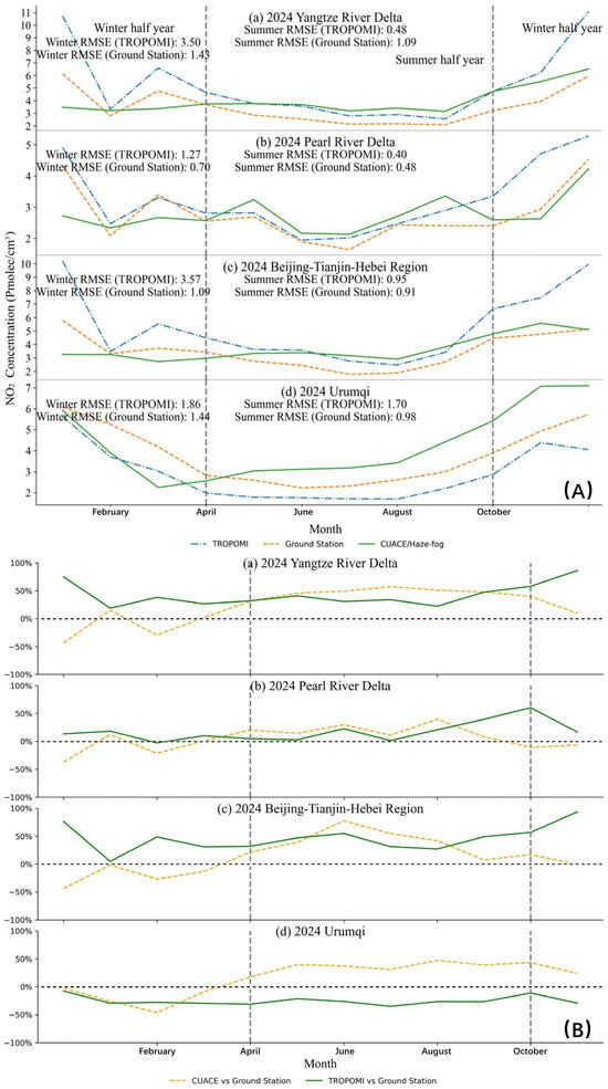 Monthly time series and bias analysis for key regions in 2024. Top panel (A) monthly mean NO2 concentration time series, comparing the TROPOMI (blue dash-dot), ground station (orange dashed), and CUACE/Haze-Fog (green solid). Annotated text provides seasonal RMSE values. Bottom panel (B) Monthly Normalized Mean Bias (NMB) relative to ground-station data, comparing CUACE/Haze-Fog (orange dash) and the TROPOMI (green solid).