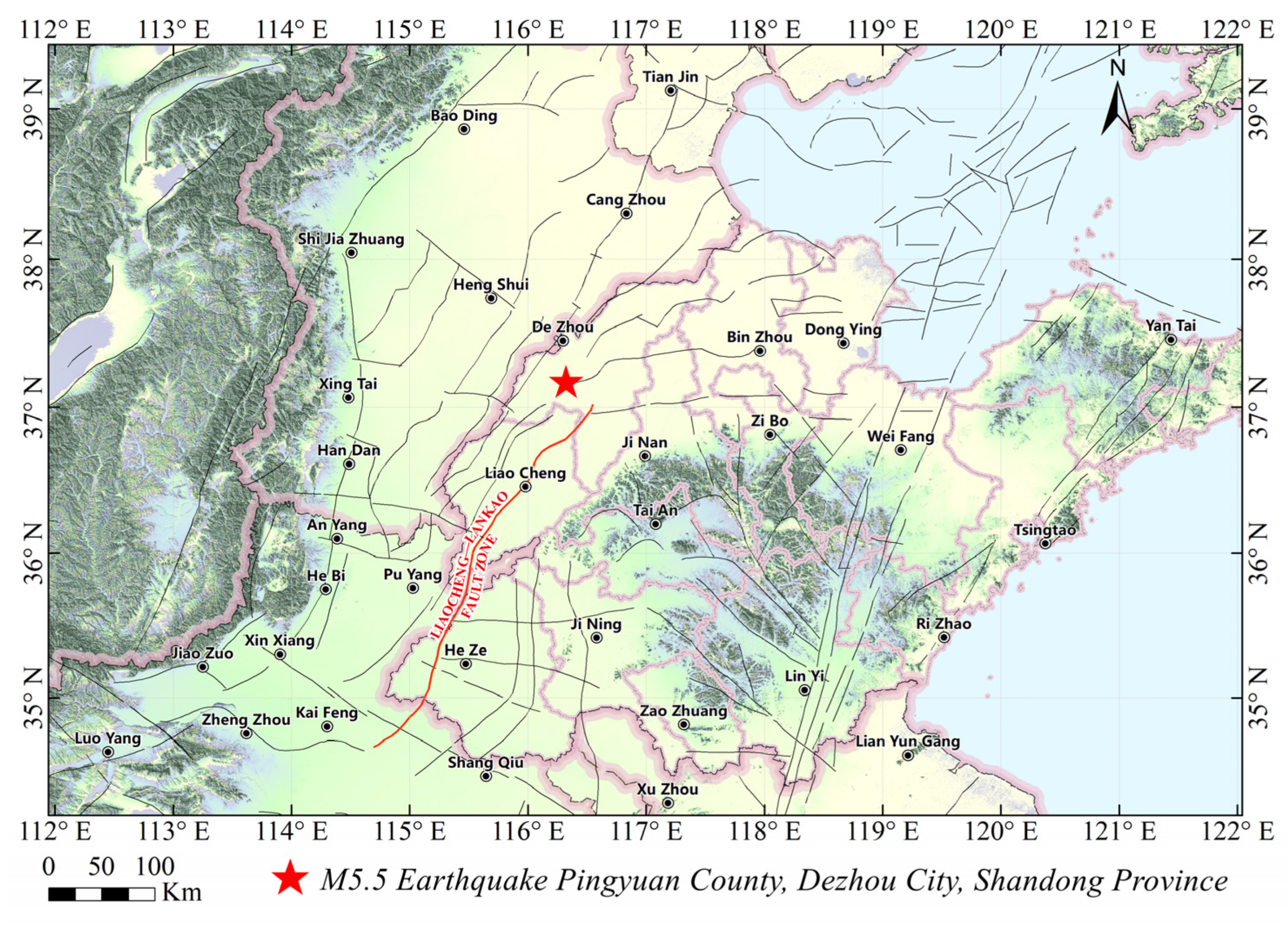 - Meng, Q.; Wang, Z.T.; Zhang, H. Numerical simulation of co-seismic deformation and seismicity following the Pingyuan M 5. 5 earthquake in Shandong Province on August 6, 2023. Acta Geol. Sin. 2024, 98, 2101–2109. [Google Scholar]