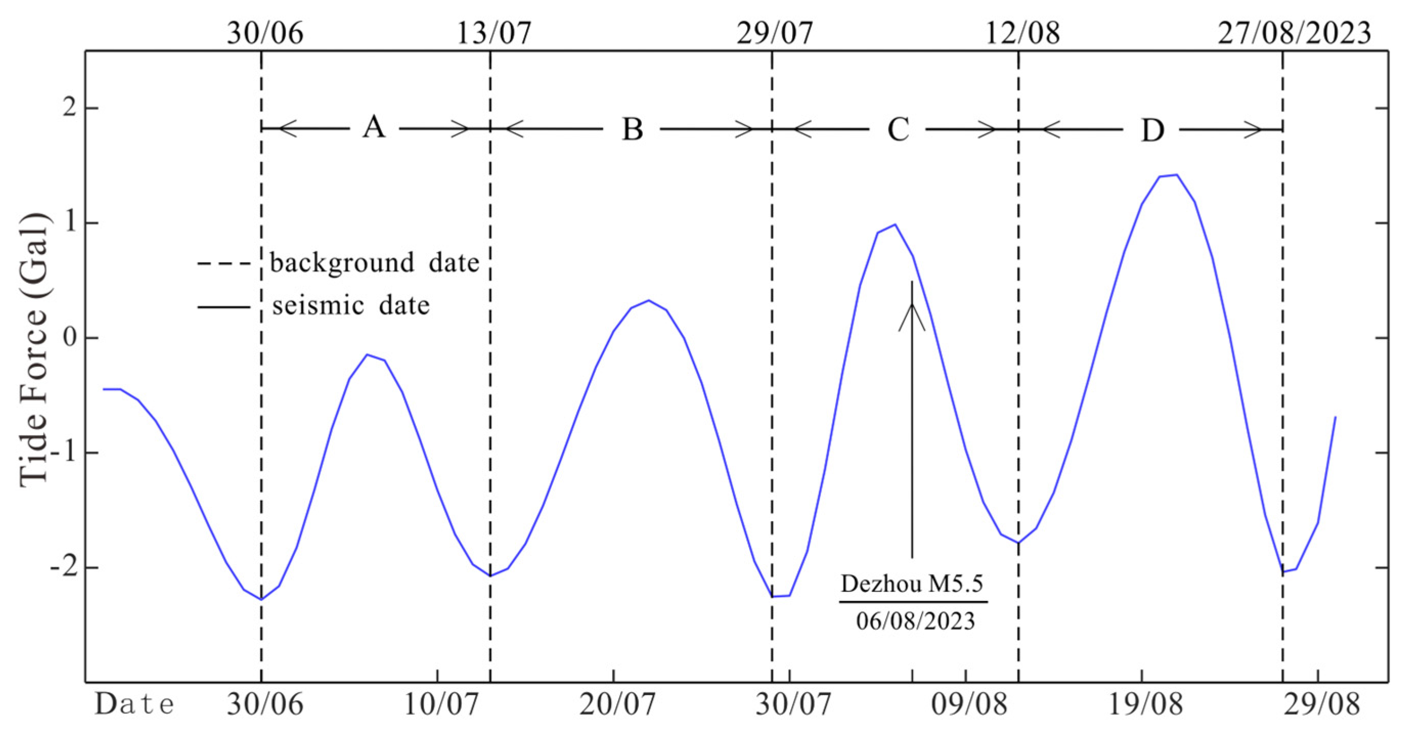 4.1. Variation Analysis of Lunar-Solar Tidal Forces in the Dezhou Ms 5.5 Earthquake