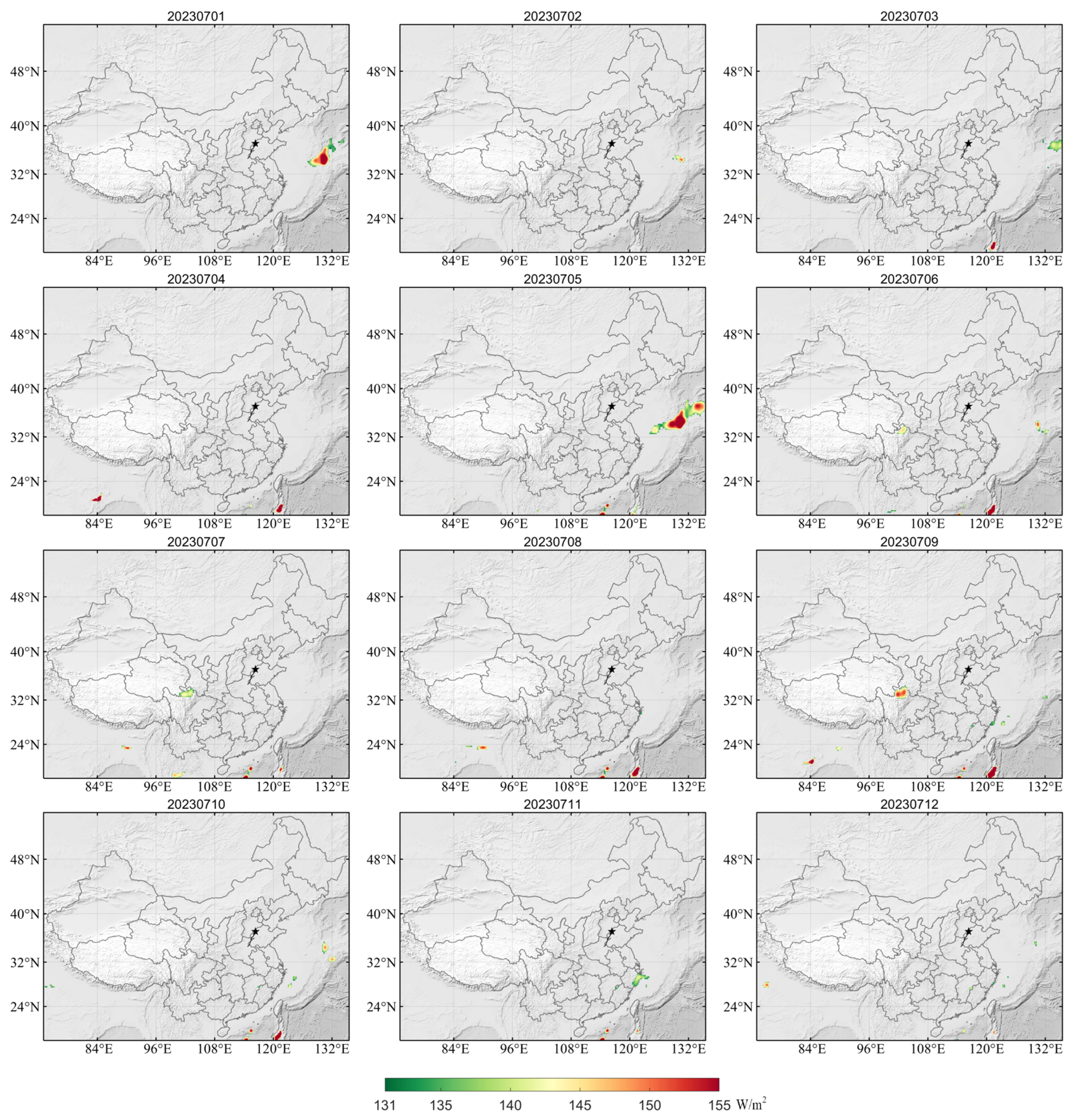 Jing, T.; Cui, J.; Wang, Q.; Liu, J.; Sun, Y.; Yang, Y.; Wang, X. Observational Study on Spatiotemporal Characteristics of Outgoing Longwave Radiation Anomalies Associated with the Dezhou Ms5.5 Earthquake. Atmosphere 2026, 17, 35. https://doi.org/10.3390/atmos17010035