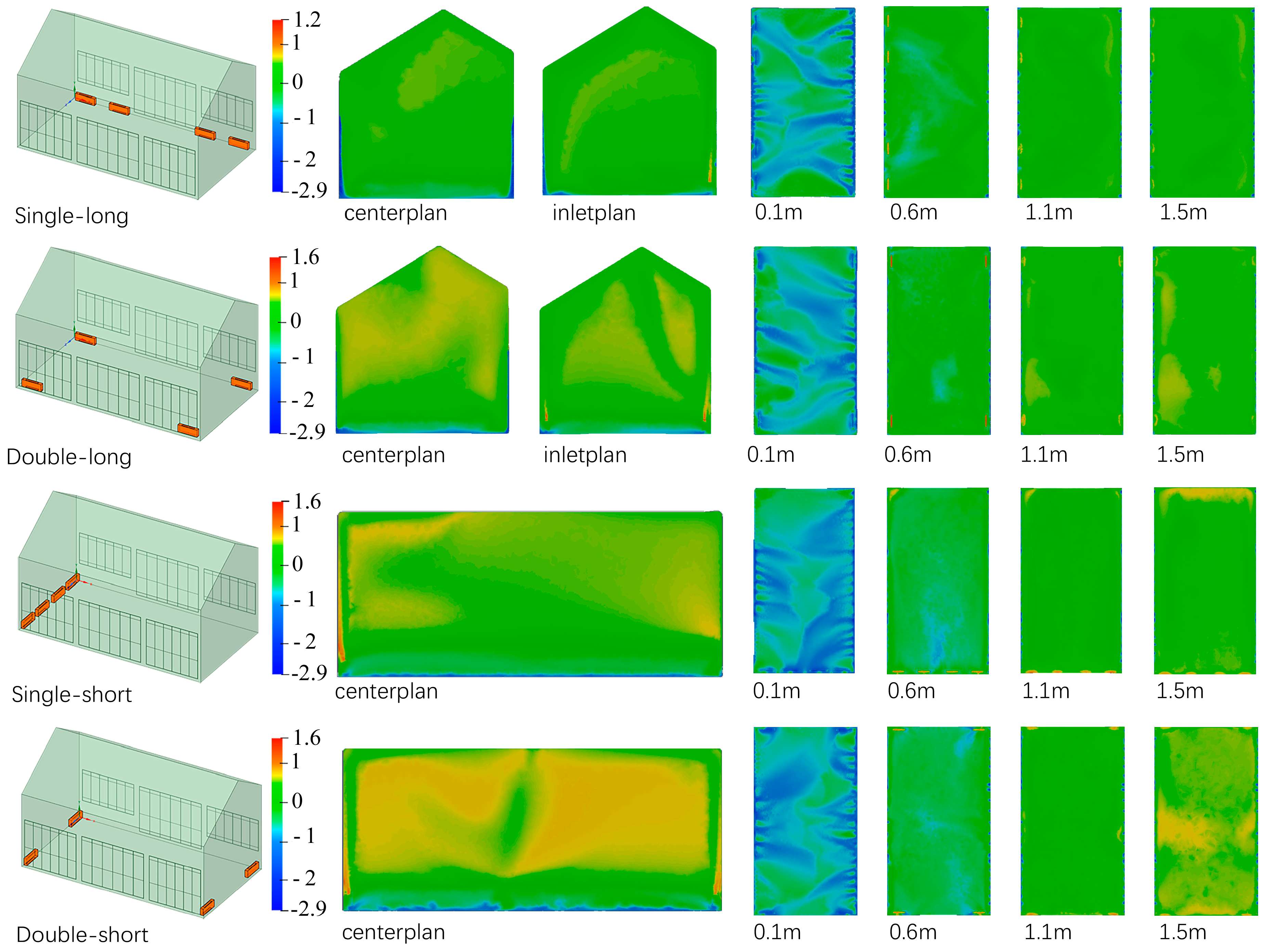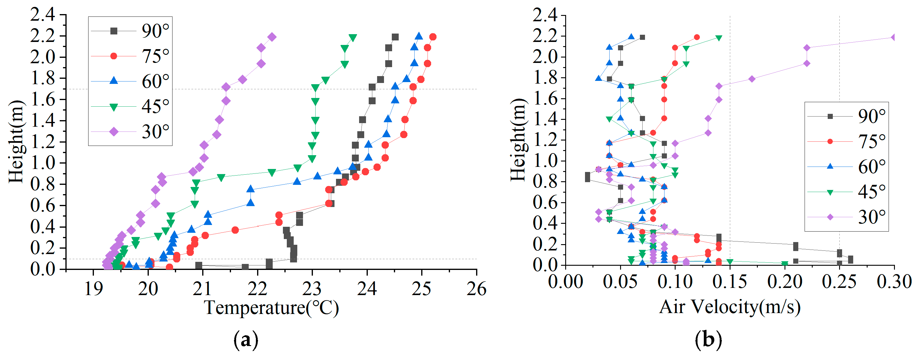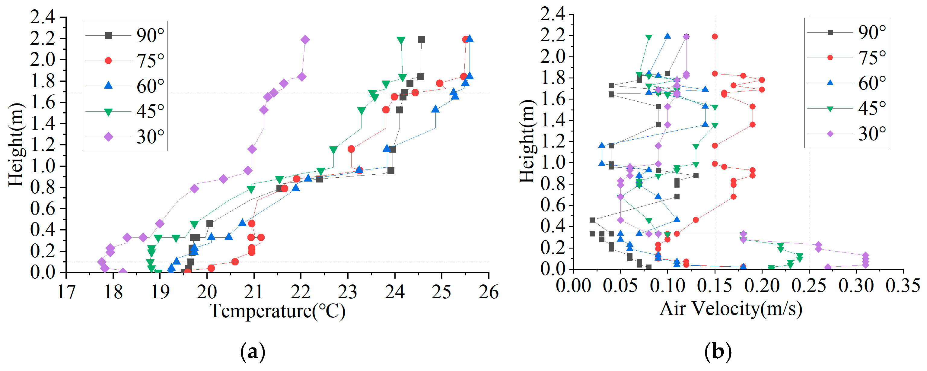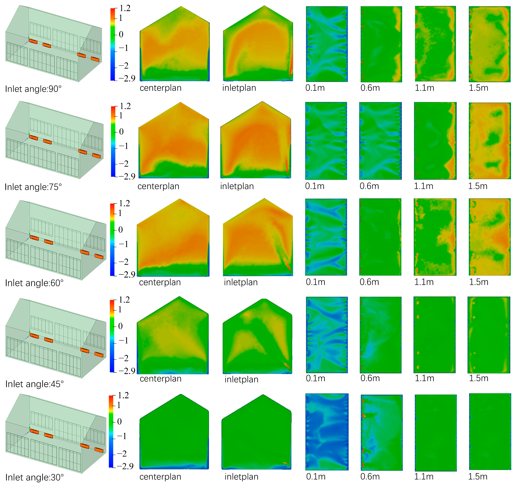 - The supply air angle influences circulation stability and heat distribution by regulating the wall-attachment effect and the directional components of jet momentum. A low angle (30°) can reduce vertical temperature gradients; however, the weakened wall-attachment effect may cause the jet to transition to a free jet, leading to local overcooling and draft discomfort near the floor. A high angle (90°) provides a more stable and comfortable environment in the occupied zone but is associated with pronounced heat accumulation near the ceiling. An intermediate angle (75°) represents a compromise, balancing temperature uniformity, airflow sensation, and heat utilization. Accordingly, for yamen-type historic buildings, differentiated supply air angles may be selected based on functional requirements: lower angles for rapid warming of occupied areas (with appropriate velocity control), higher angles (90°) for static comfort and heritage conservation priorities, and intermediate angles (75°) for integrated performance;