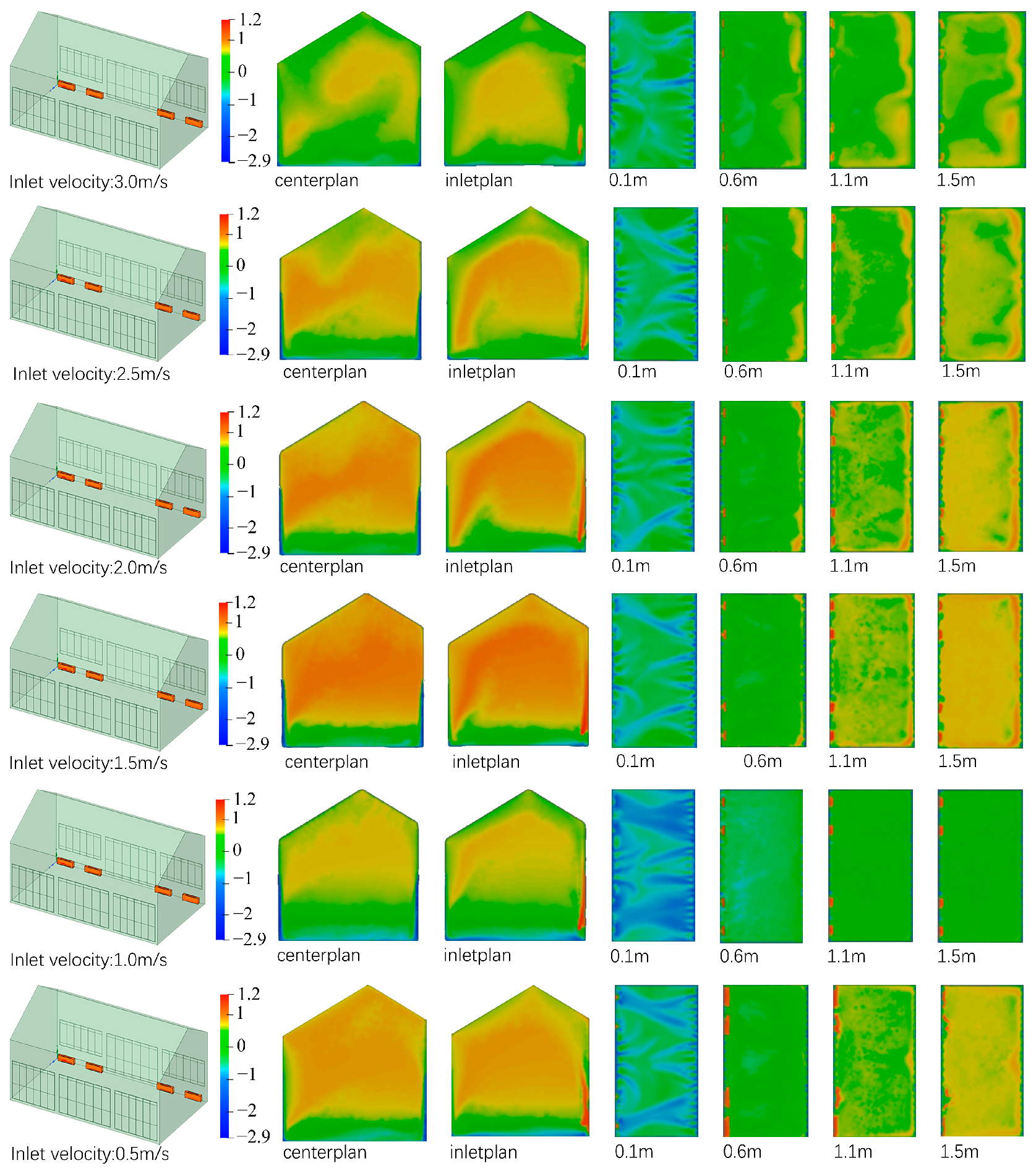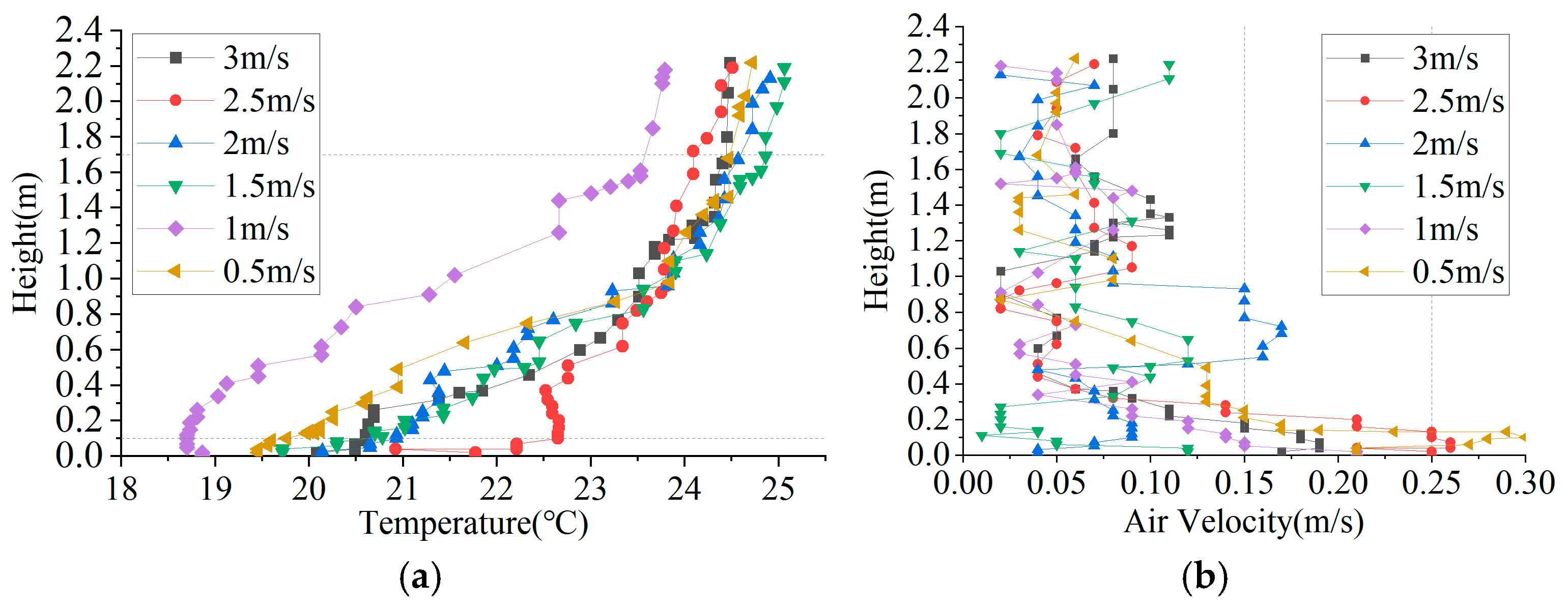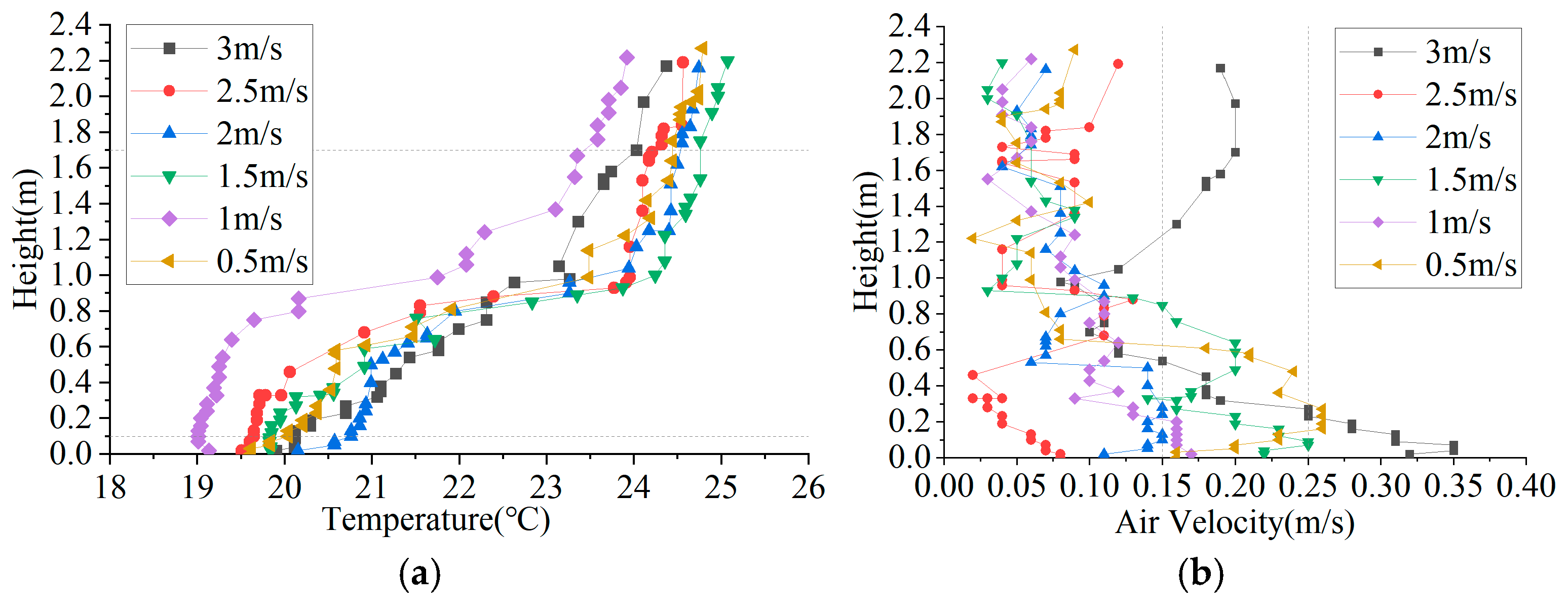 - Supply air velocity is the dominant parameter for improving indoor thermal comfort. Increasing the air velocity enhances jet momentum and air mixing, thereby reducing heat accumulation near the ceiling, alleviating vertical temperature stratification, and increasing the proportion of the comfort zone. However, excessively high velocities (≥2.5 m/s) tend to induce draft discomfort near the floor, whereas excessively low velocities (<1.5 m/s) provide insufficient momentum, leading to the coexistence of heat stagnation in the upper zone and cold air stagnation near the floor. Overall, a moderate supply air velocity of approximately 2 m/s achieves a balance between temperature uniformity and airflow comfort, representing a more favorable operational range;