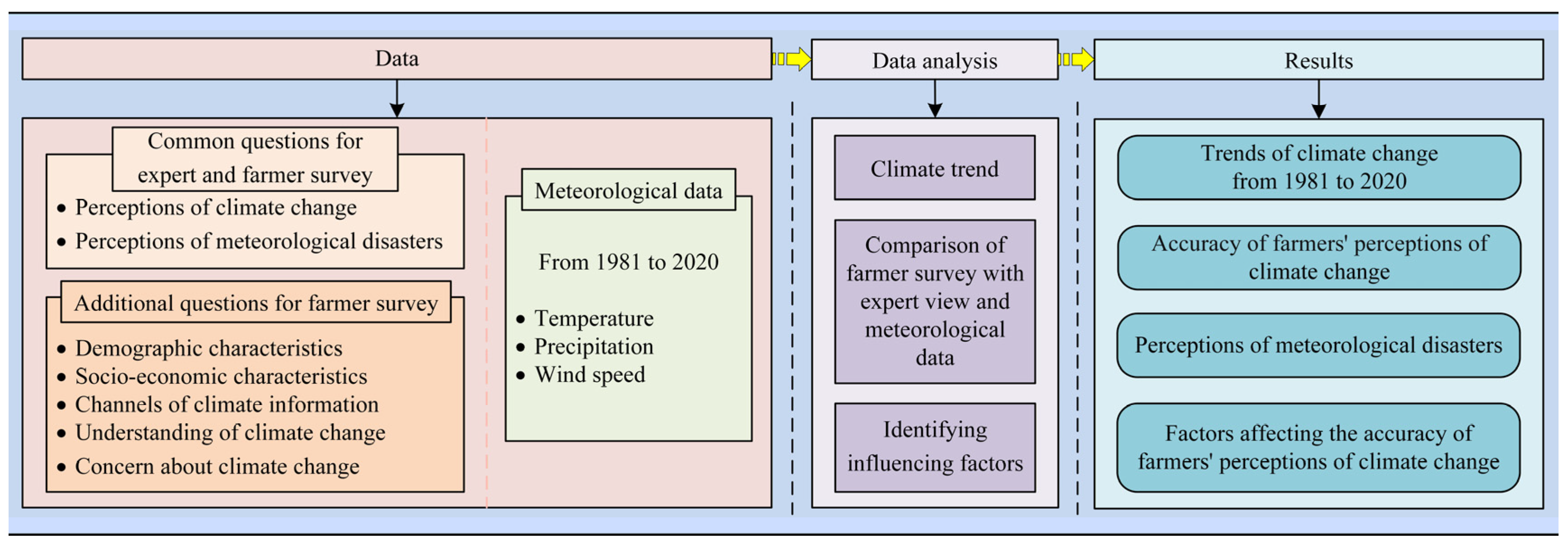 - Qin, Y.; Cao, Z.; Shi, X. Comparison of farmers’ climate change perceptions with measured data and influencing factors—A case study of farmers in the Loess Plateau of northern Shaanxi. Geogr. Res. Dev. 2022, 41, 161–166. (In Chinese) [Google Scholar]