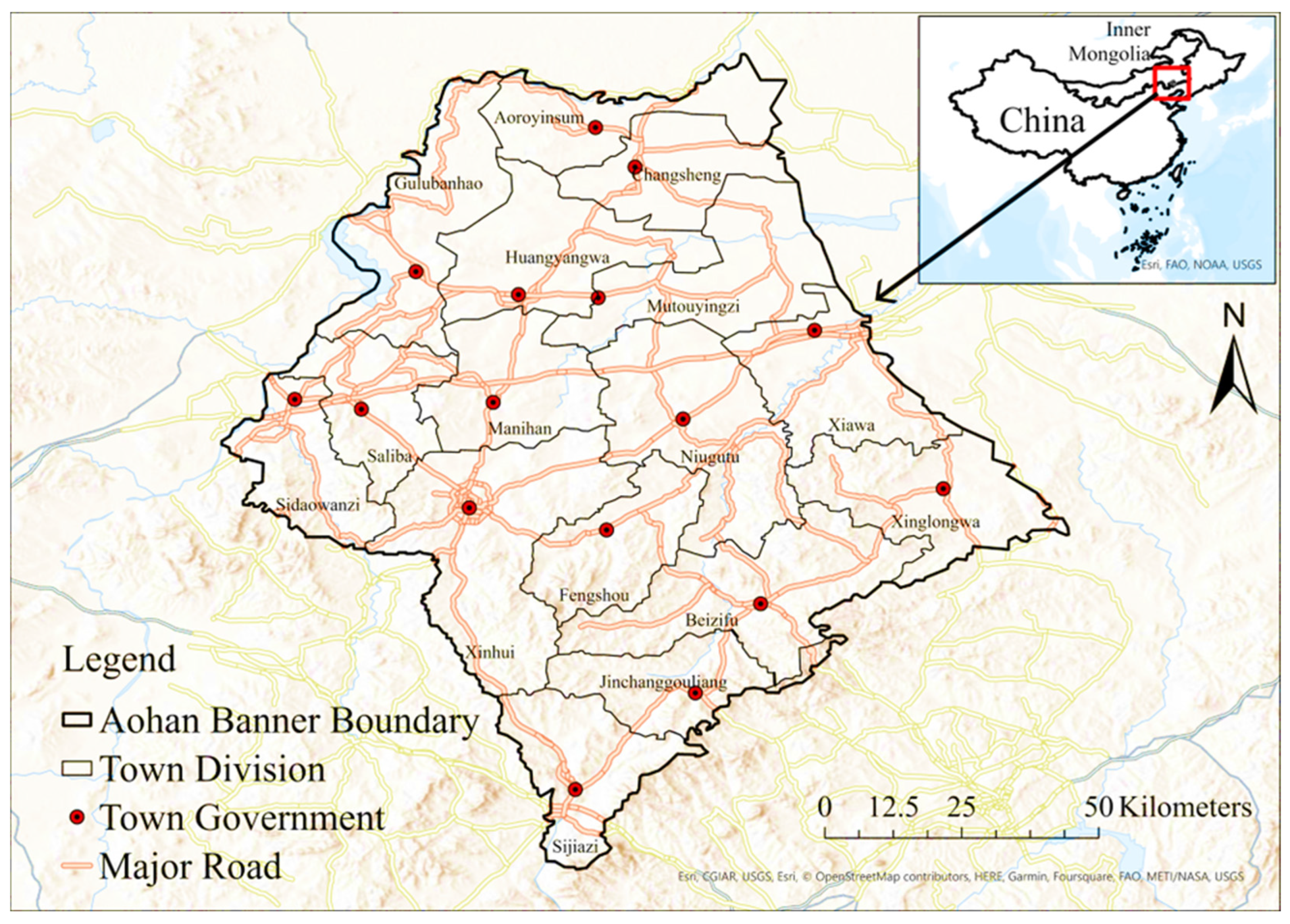 - Zhao, H. The Application of 3S Technology in Returning Farmland to the Forest (Grassland) in the County Area—Taking Chifeng City Aohan Banner as an Example. Master’s Thesis, Inner Mongolia Normal University, Hohhot, China, 2008. (In Chinese). [Google Scholar]