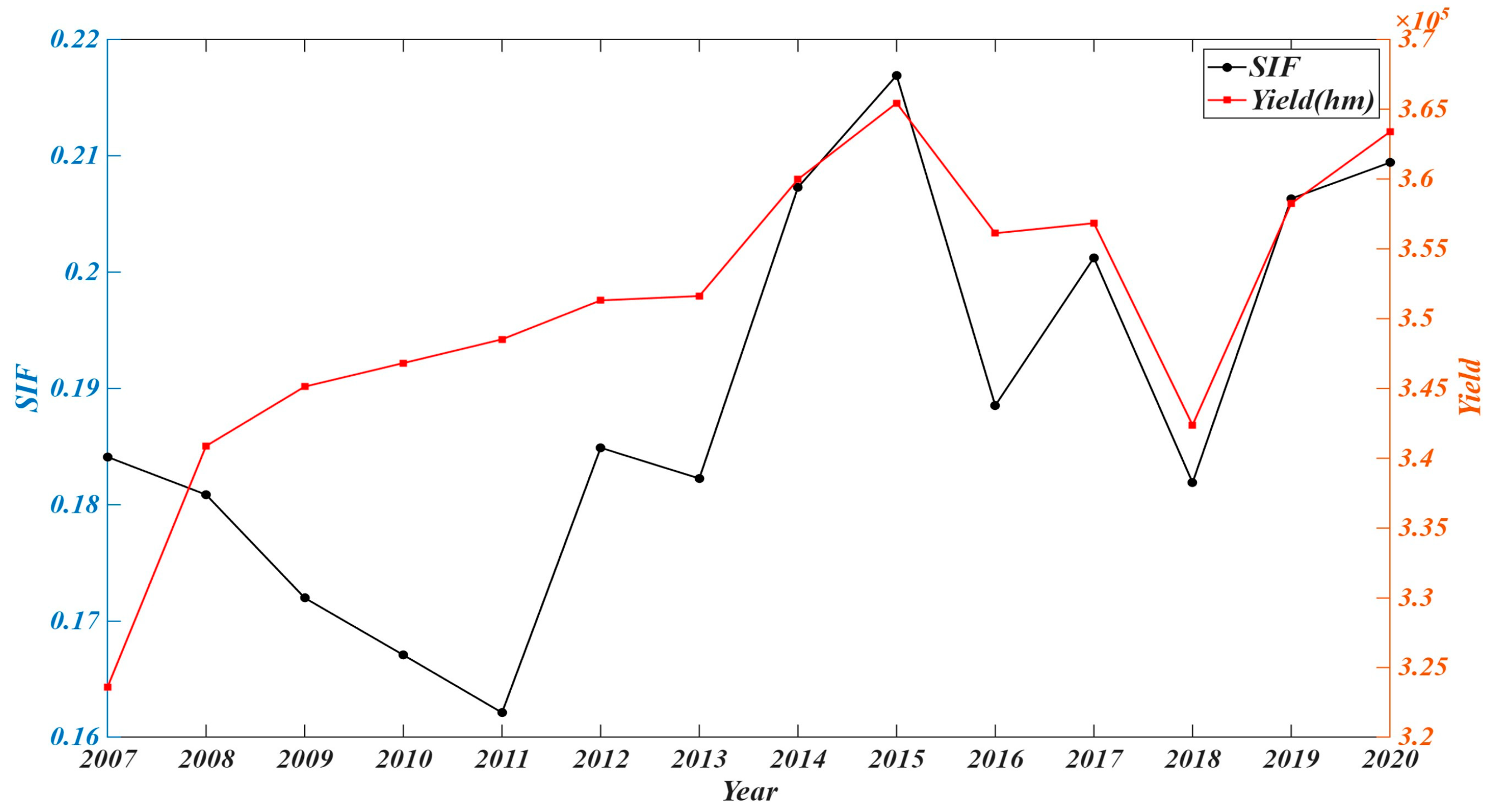 3.1. Inter-Annual Variation in SIF and Winter Wheat Yield