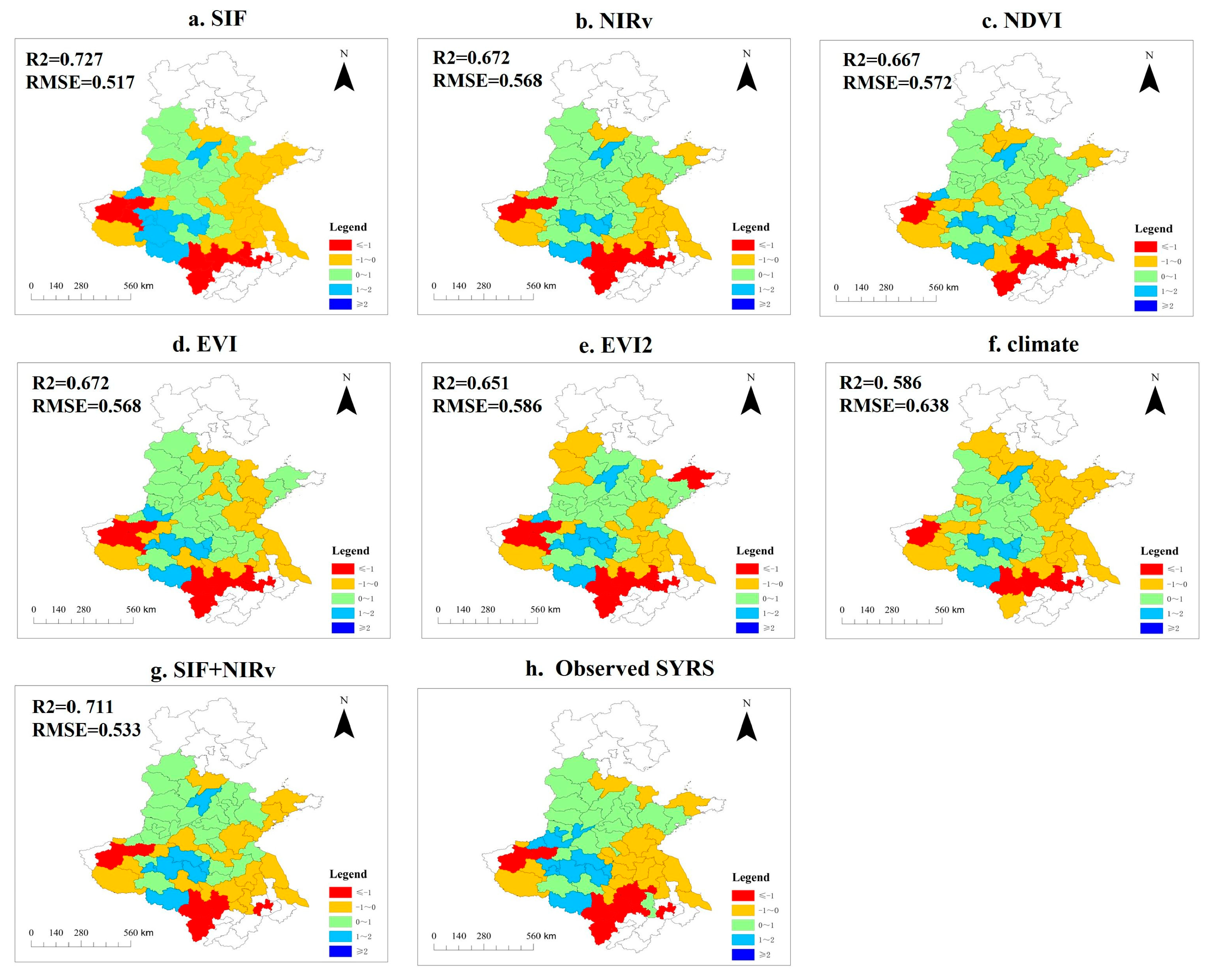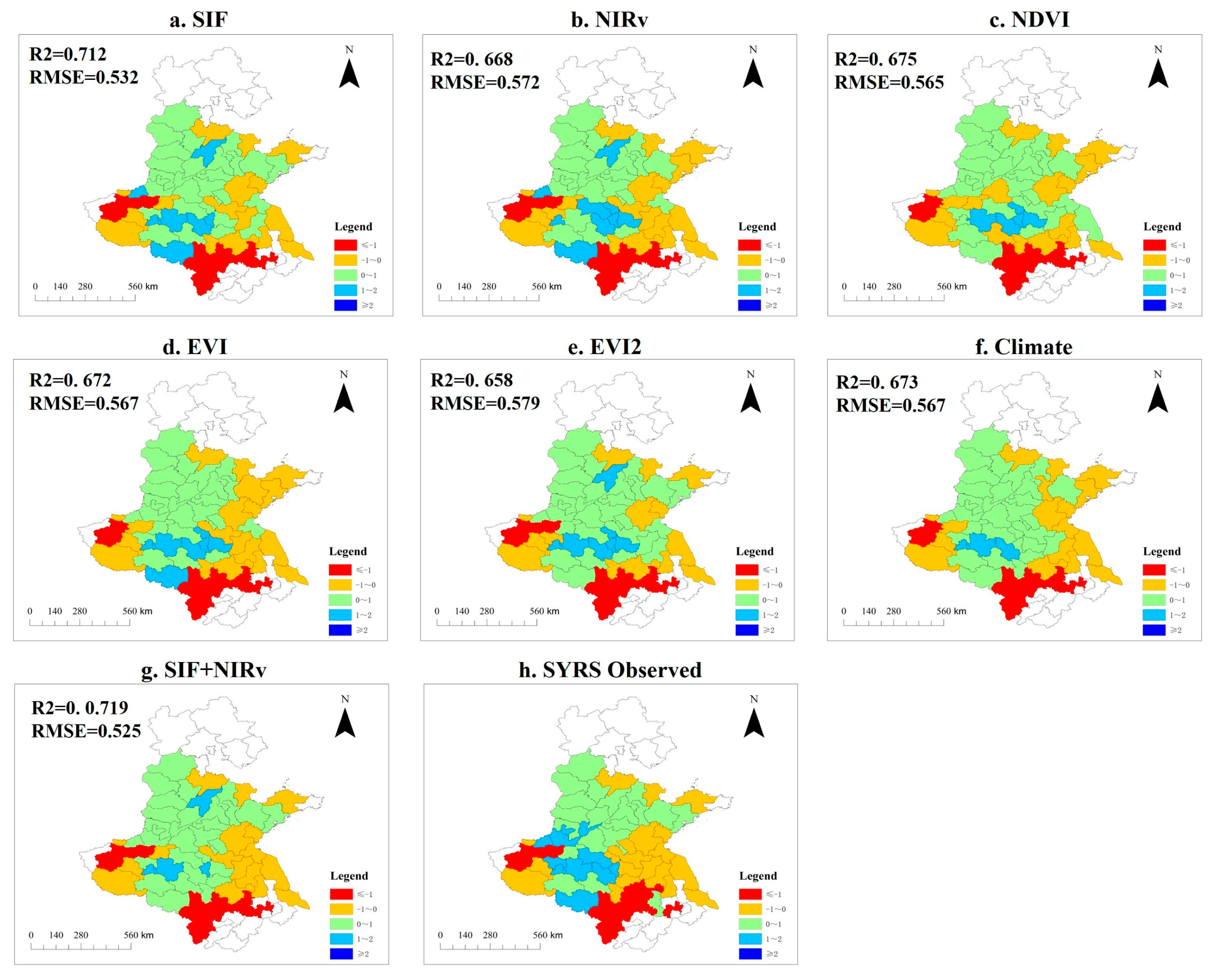 - By integrating multiple sources of data, the models based on normalized anomalies of these variables could directly quantify drought-induced yield losses without the need for additional auxiliary data or complex computations. Among all combinations of vegetation variables, SIF demonstrated superior performance, yielding the most accurate predictions.