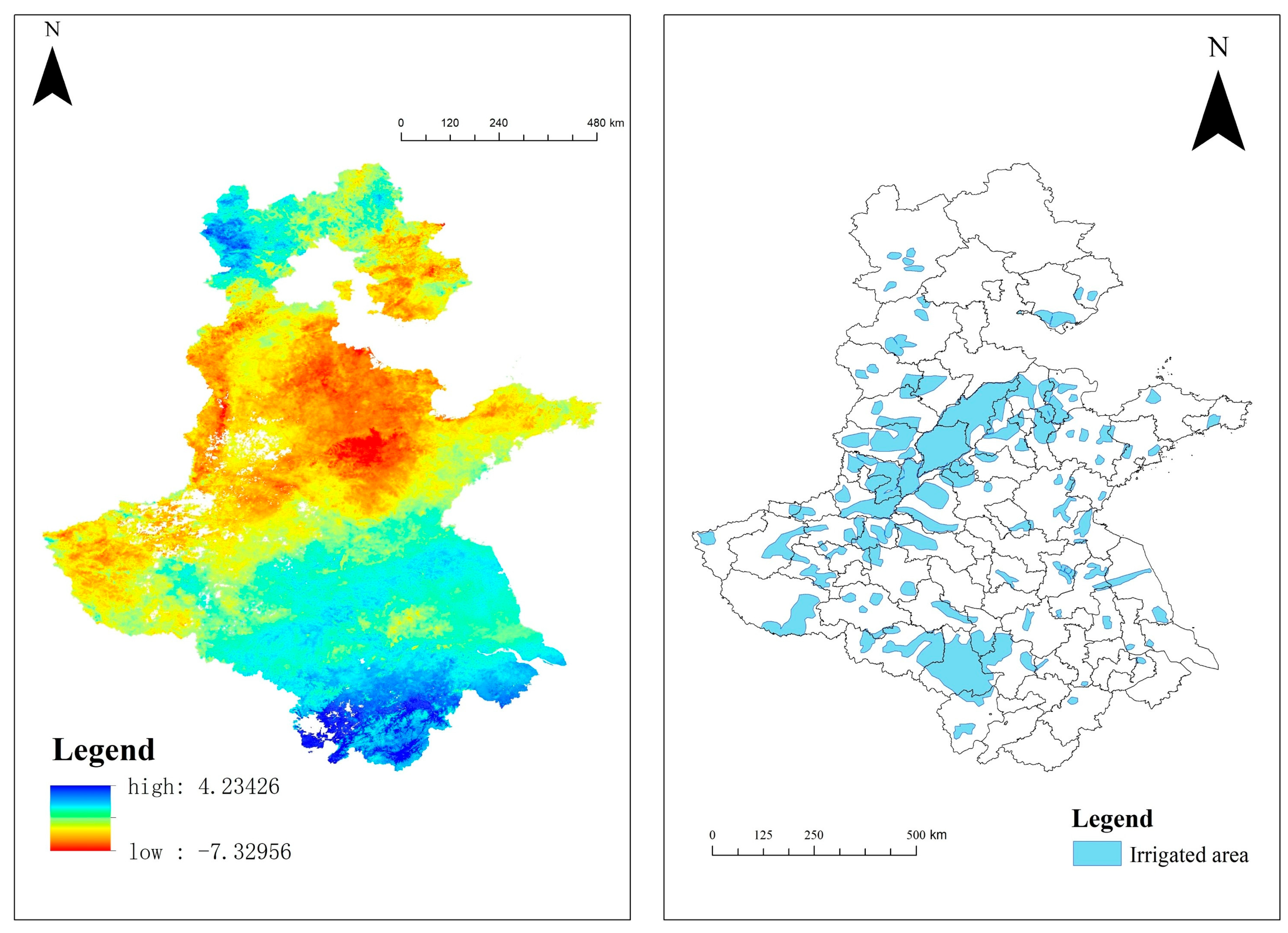 - Yang, J.; Wu, J.; Liu, L.; Zhou, H.; Gong, A.; Han, X.; Zhao, W. Responses of Winter Wheat Yield to Drought in the North China Plain: Spatial–Temporal Patterns and Climatic Drivers. Water 2020, 12, 3094. [Google Scholar] [CrossRef]