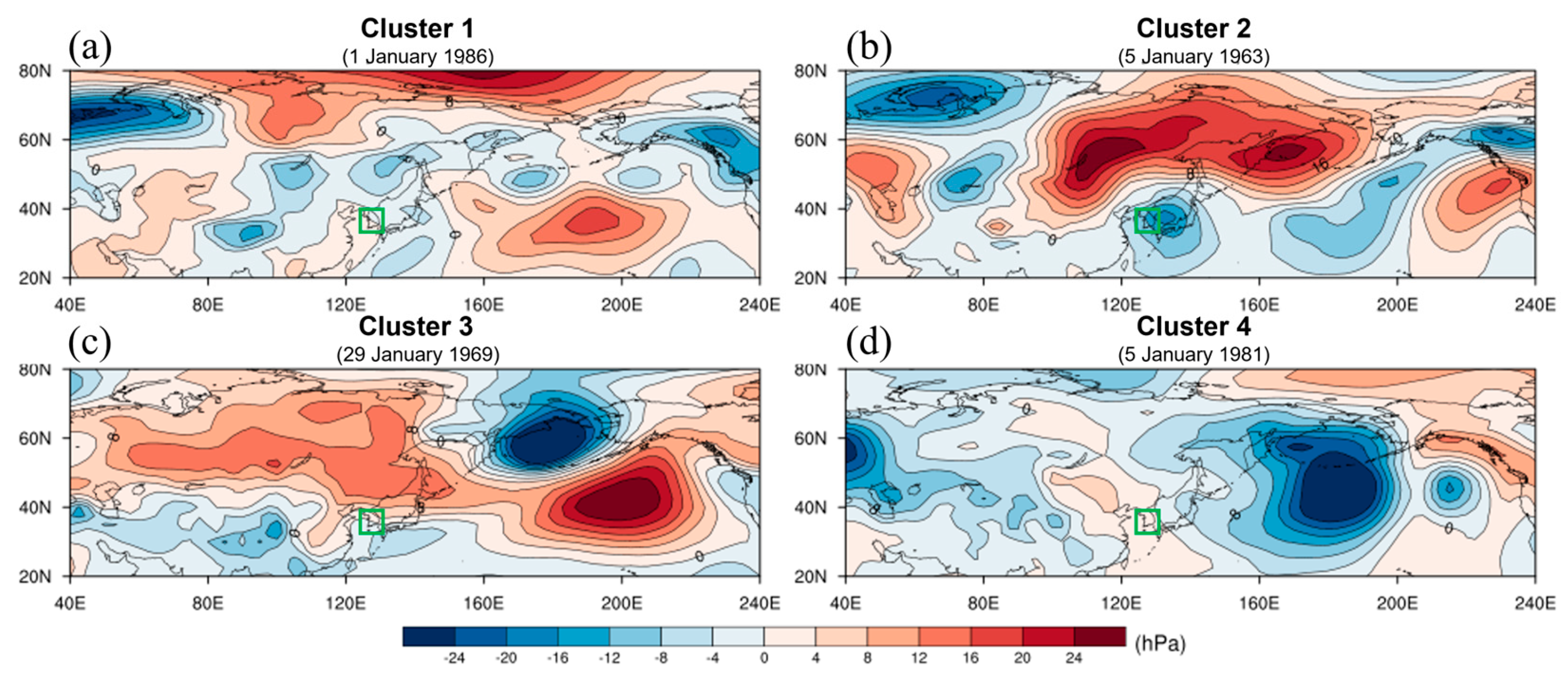 The spatial distribution of mean sea-level pressure anomalies (hPa) associated with atypical cases: (a) cluster 1 (1 January 1986), (b) cluster 2 (5 January 1963), (c) cluster 3 (29 January 1969), and (d) cluster 4 (6 January 1981). The green box represents focus on Korea.