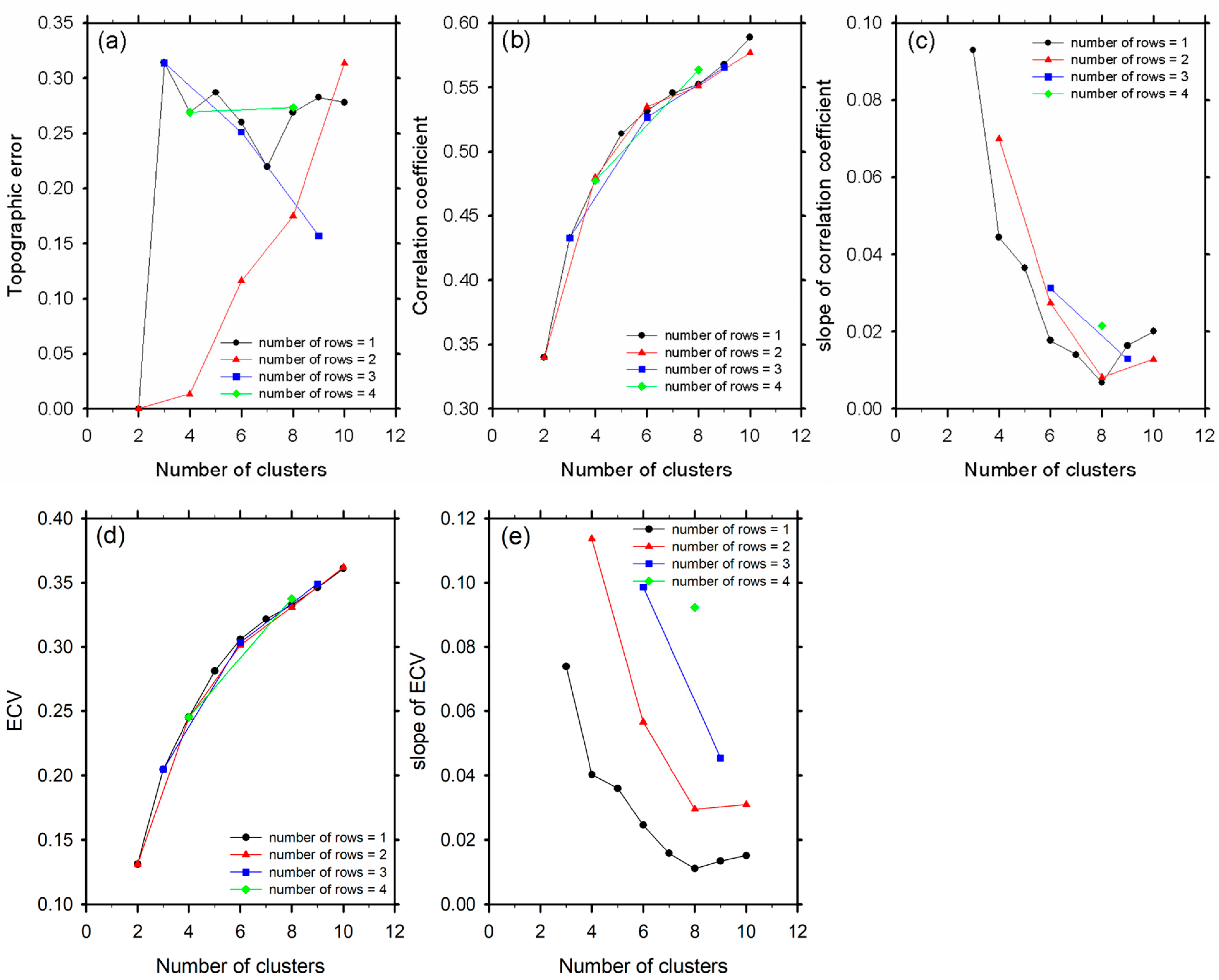 Graphs showing (a) topographic error (TE), (b) average of pattern correlation coefficient (PCC), (c) slope of the average PCC, (d) Explained cluster variance (ECV), and (e) the slope of ECV with an increasing number of clusters for the number of rows.