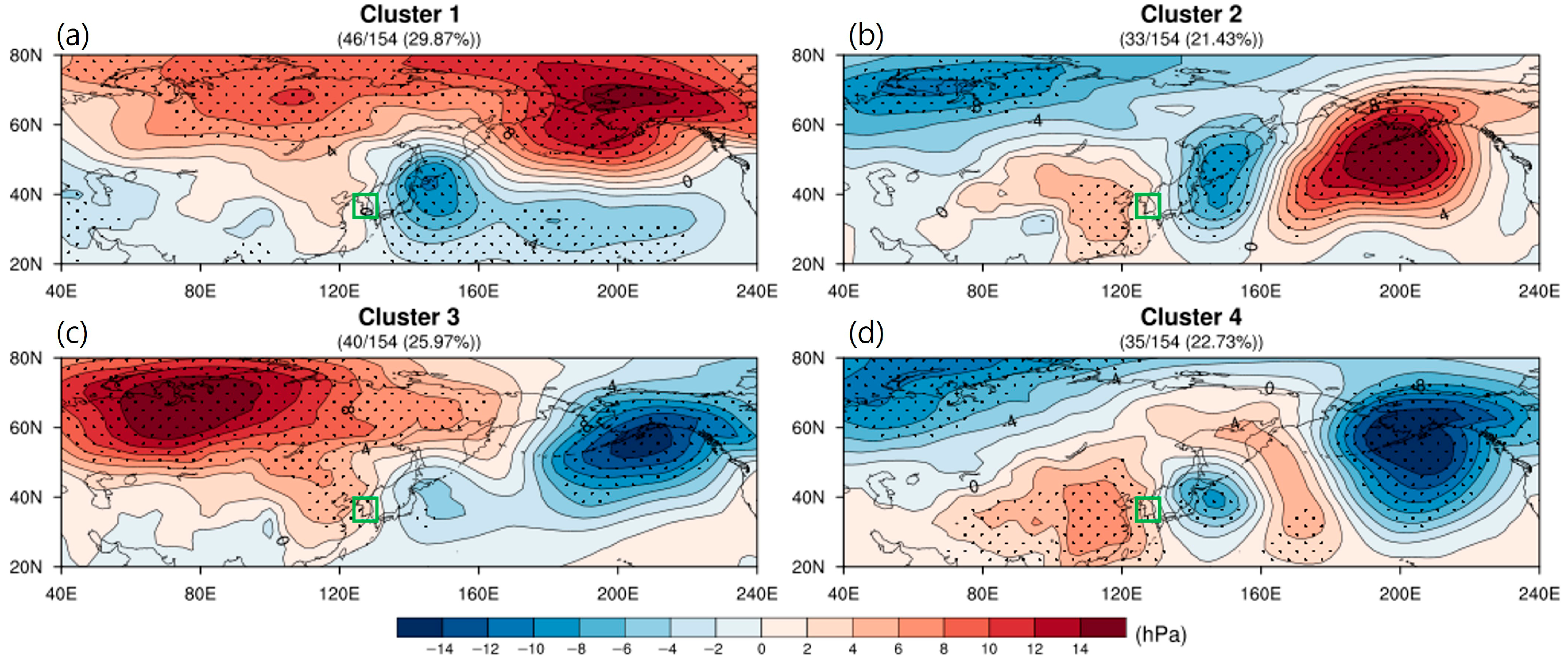 The spatial distribution of mean sea-level pressure (MSLP) anomalies of severe cold on Korea in January for four clusters classified by the SOM-PC patterns (2 × 2 nodes) for (a) cluster 1, (b) cluster 2, (c) cluster 3, and (d) cluster 4. The dots indicate the significant values, at a 95% confidence level. The green box represents focus on Korea.