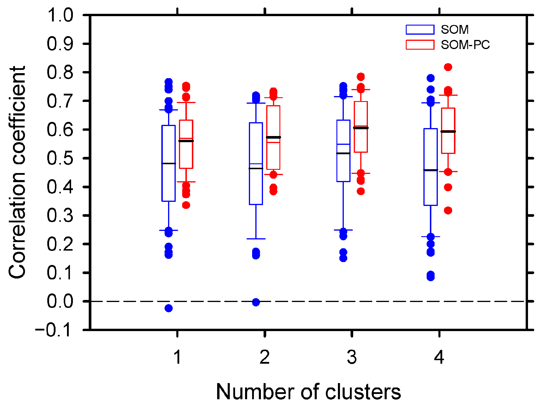 Box plot of the pattern correlation between the self-organizing map (SOM) and within the SOM cases. The blue and red results represent the SOM classification and SOM-PC, respectively. Lines in each box represent the median and average values of the correlation coefficient. The colored circles represent outliers. The dashed line indicates zero correlation coefficient.