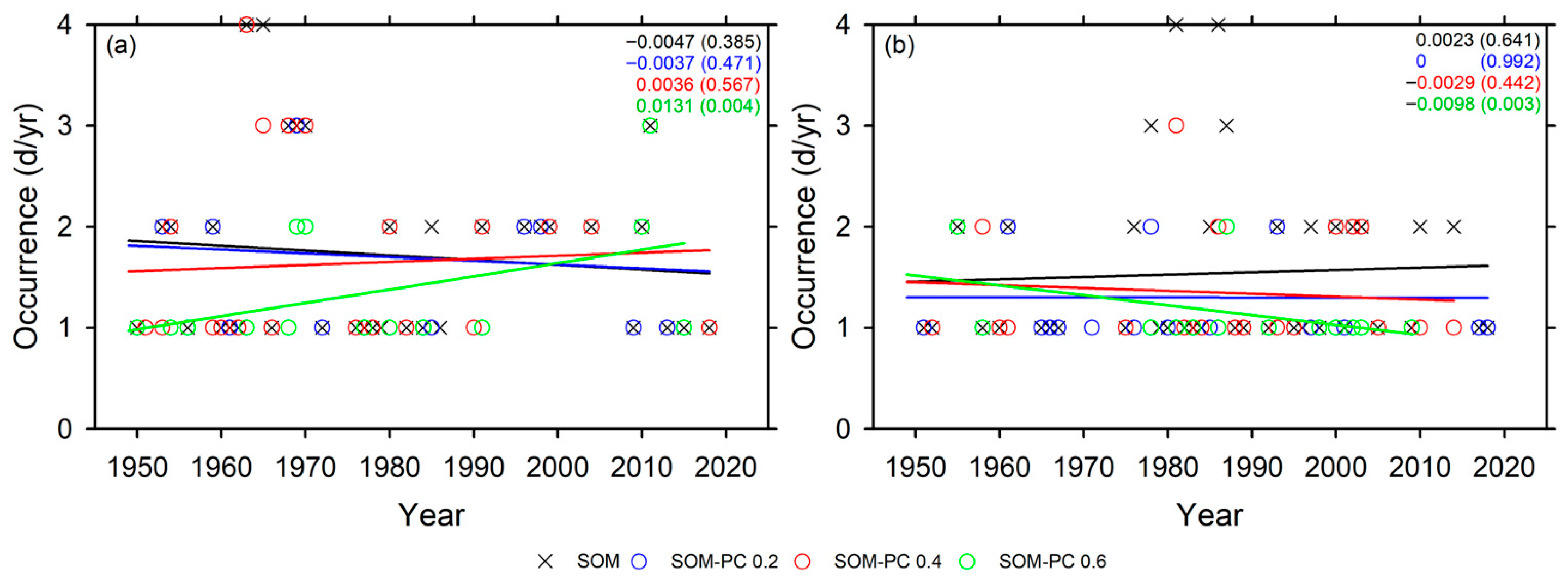 Trend in circulation patterns and cold severe cold on Korea in January for (a) cluster 1 and (b) cluster 4 classified by the SOM and SOM-PC classified patterns (2 × 2 nodes). Time series of SOM (black) and SOM-PC that is the selected threshold pattern correlation coefficient of 0.3 (blue), 0.4 (red), 0.5 (green) circulation pattern occurrence (d/yr). The slopes are the trend line and p values (in parentheses).