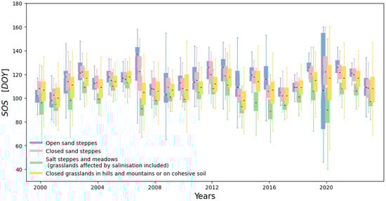 Interannual variability of SOS across grassland types during the study period, calculated as the mean SOS for the whole country in a particular year. The box height represents the spread of the middle 50% of the observations (from the 25th to the 75th percentile), while the black line inside the box marks the median. The whiskers extend to the most extreme values within 1.5 times the interquartile range. Different box colors correspond to different grassland types.