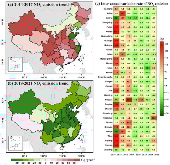 Linear trend of provincial NOx emissions in mainland China (a) from 2014 to 2017 and (b) from 2018 to 2021, and (c) relative changes in NOx emissions of each province between adjacent years during 2014–2021.