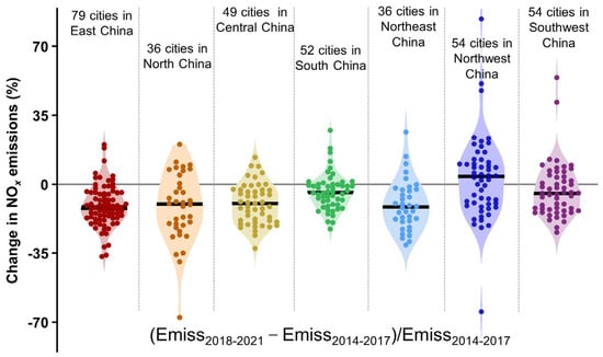 Change in NO2 emissions (percent per year) in the 4 years since the implementation of the Three-Year Action Plan to Win the Battle of Blue Sky. Changes are annual total emissions during 2018–2021 compared to the period 2014–2017, and are shown for individual cities (dots) separated in seven geographical subdivisions. The median of the city’s values is shown for each region, with the plotted violins showing the distribution of the data using a kernel density estimation. Different colored dots represent cities in each region, and light colored paddings indicate the density of data distribution.