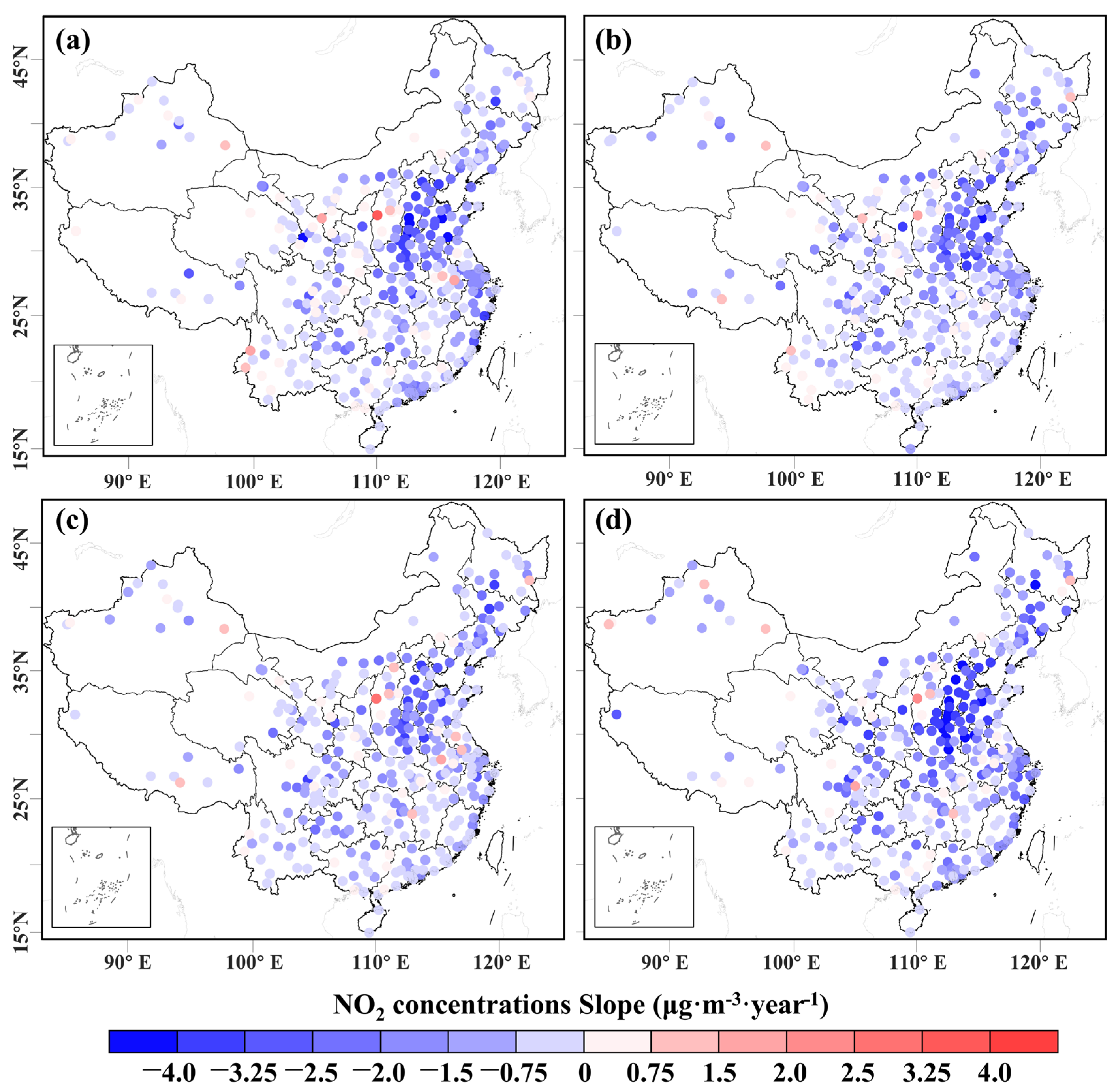 Spatial distributions of annual mean NO2 concentrations trends across prefectural cities in China during (a) spring, (b) summer, (c) autumn, and (d) winter from 2014 to 2021.
