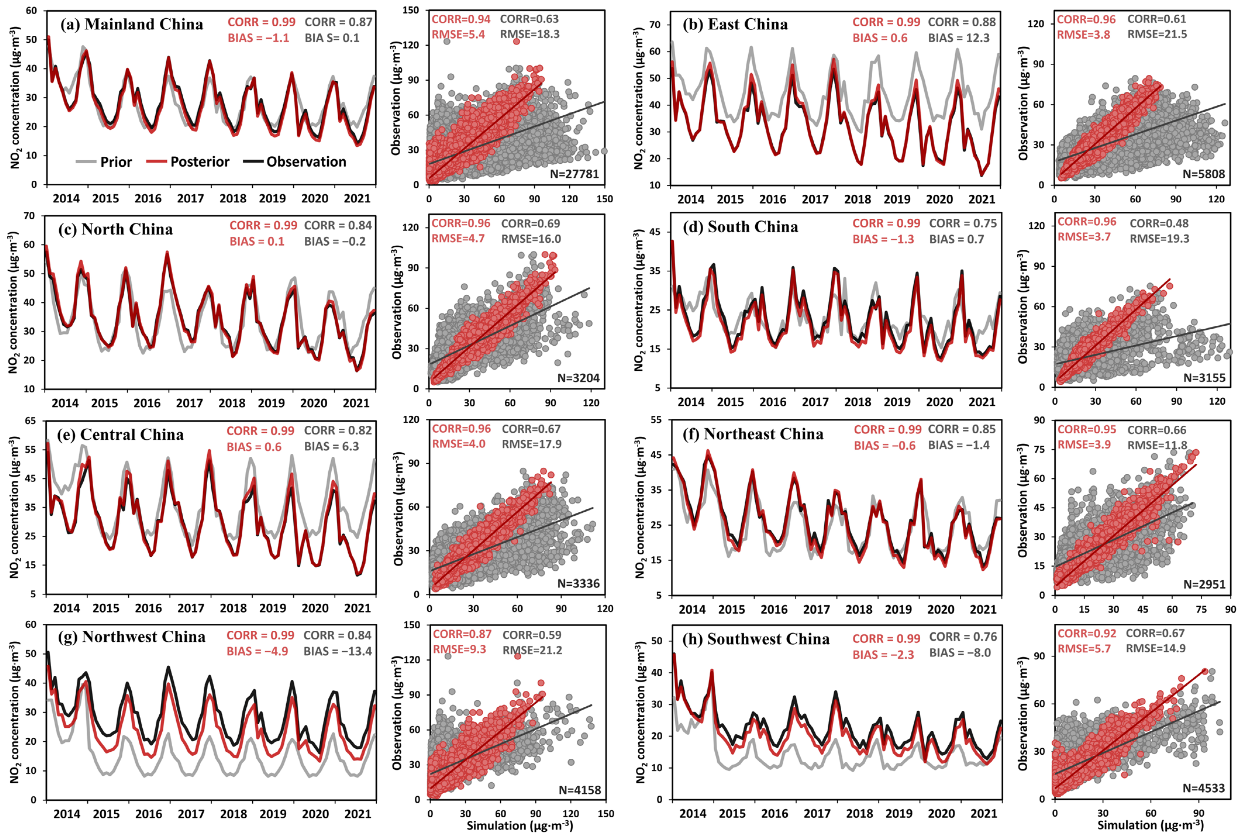 Comparison of monthly (line) and daily (scatter) average NO2 concentrations between simulations and observations for Mainland China and seven geographical subdivisions from 2014 to 2021 (a–h). Simulated results were extracted based on the locations of observation sites. In the scatter plots, red and gray dots represent comparisons between ground-based observations and simulations using posterior and prior emissions, respectively. BIAS, the mean biases (simulated minus observed); RMSE, the root mean square errors; CORR, the correlation coefficients.