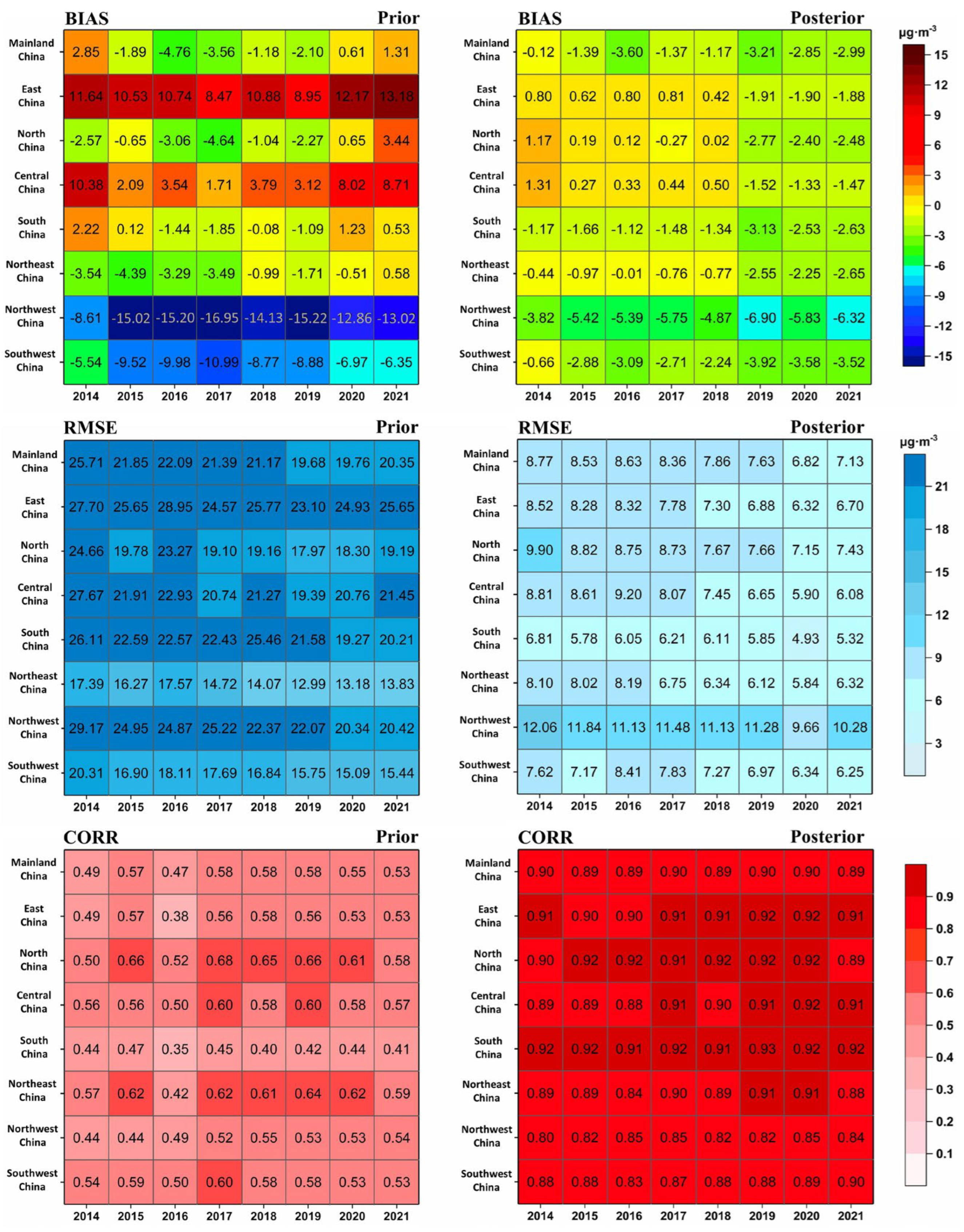 Thermal maps of the biases (BIAS, simulated minus observed), root mean square errors (RMSE) and correlation coefficients (CORR) of NO2 concentration between prior and posterior simulations against ground observations during 2014–2021.
