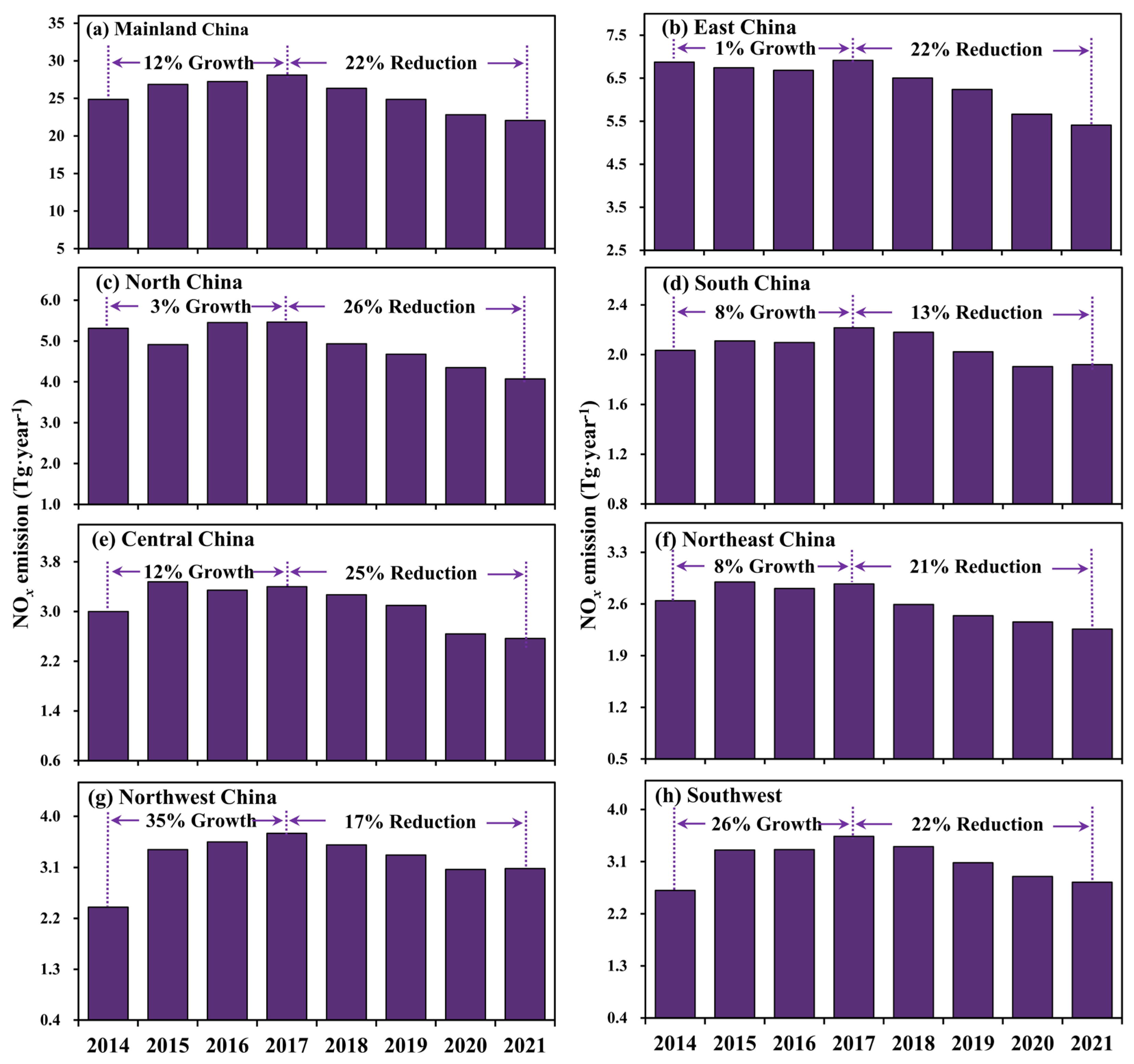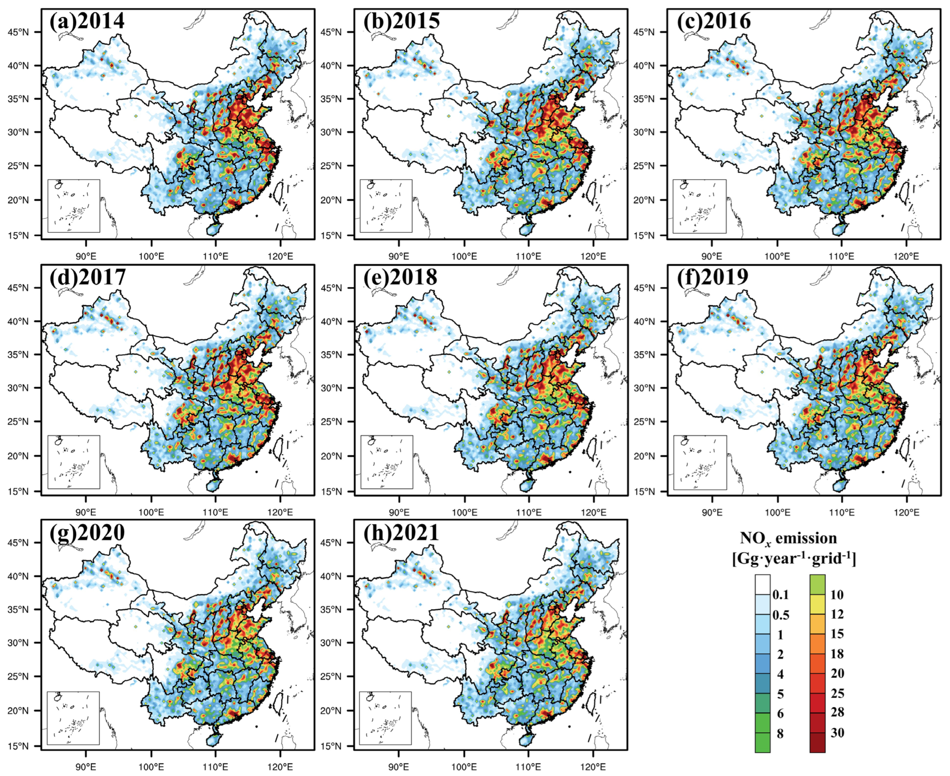This study used national ground monitoring station data and the established Regional multi-Air Pollutant Assimilation System (RAPAS) to reveal multi-year seasonal NO2 patterns and generate a ground-observation-constrained, high-resolution anthropogenic NOx emission inventory for China (2014–2021). Then, the reliability of the inventory was quantitatively evaluated, followed by the analysis of multi-year spatiotemporal variations and emission trends across distinct geographic regions. The national-scale estimations of NOx emission pinpoint the interannual variation trend of anthropogenic NOx emissions, critically reflect socioeconomic dynamics from an emission perspective, and provide essential insights into the effectiveness of a series of air pollution prevention and control action plans implemented in China.