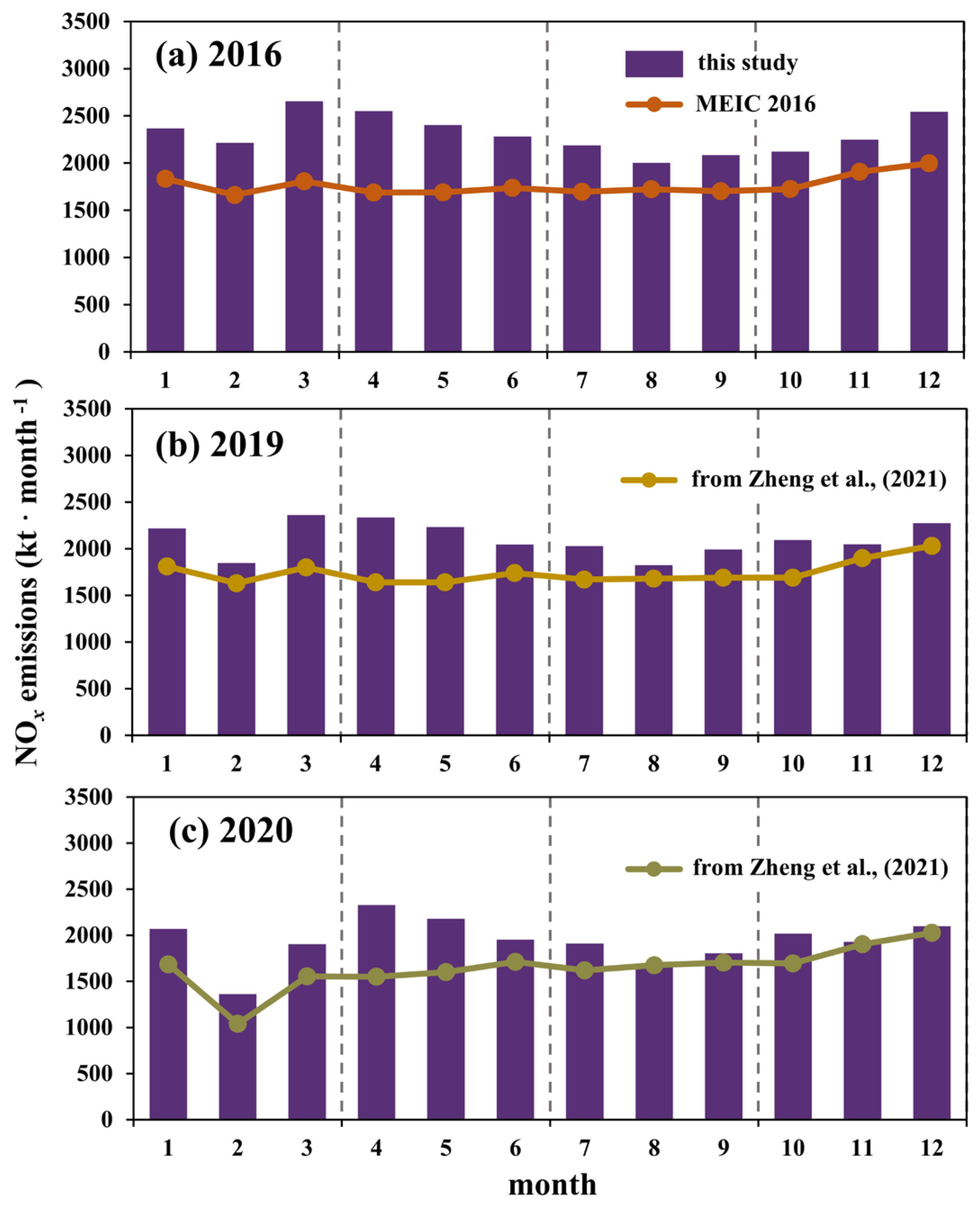 Monthly NOx emissions estimated in this study, MEIC, and the study of Zheng et al., 2021 [66] in 2016, 2019, and 2020.
