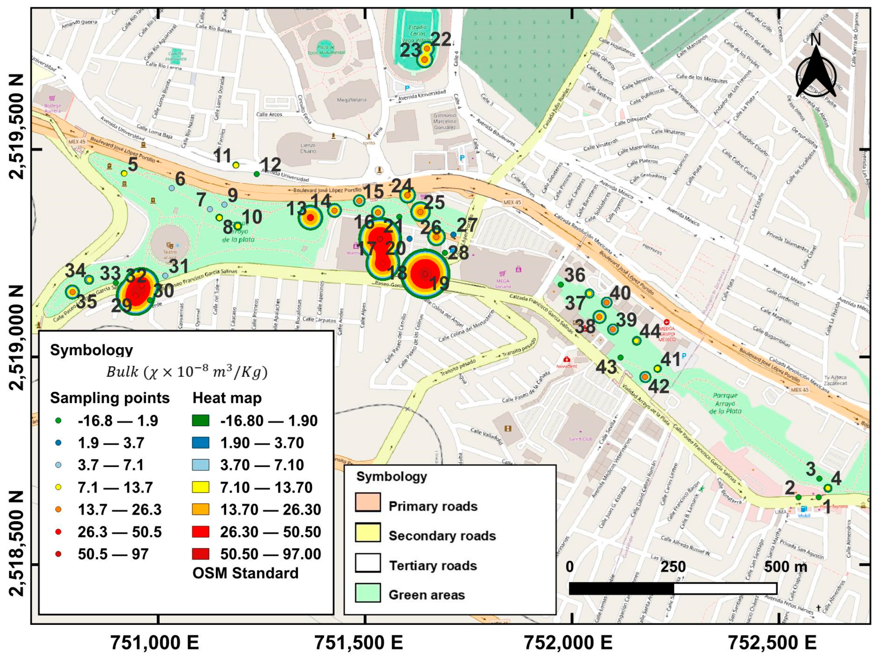 - Castañeda-Miranda, A.G.; Chaparro, M.A.; Pacheco-Castro, A.; Chaparro, M.A.; Böhnel, H.N. Magnetic biomonitoring of atmospheric dust using tree leaves of Ficus benjamina in Querétaro (Mexico). Environ. Monit. Assess. 2020, 192, 382. [Google Scholar] [CrossRef]