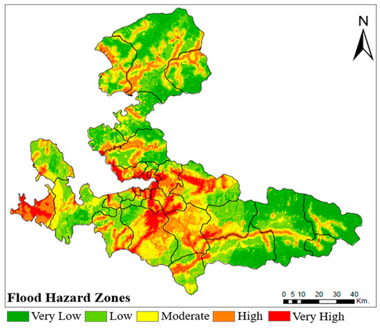 The ultimately derived expressions for and are written in Equations (14) and (15), and the associated spatial maps (i.e., flood hazard map and flood vulnerability map) are depicted in Figure 5 and Figure 6, respectively. The natural break approach was used to identify risk areas.