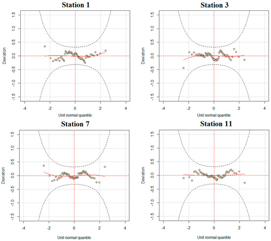 Models were created using annual maximum rainfall data from 13 stations, with both stationary and non-stationary models using the 15 potential covariate variables specified in Table 2. In the creation of the models, four two-parameter distributions were considered, namely, gamma (GA), logistic (LOGIS), lognormal (LOGNO), and Weibull (WEI). As mentioned in Section 4.3, models were created using the GAMLSS method in different scenarios and the most appropriate distributions were selected according to the AIC criteria. Table 7 summarizes the selected distributions, mathematical models of the distribution parameters, AIC values, Filliben coefficients, and LR test p values. In addition, a comparison of four different probability distributions for stationary models at each station is presented in Supplementary Table S1. As can be seen from Table 7, LOGNO and GA distributions were selected as the best distributions at 10 and 3 stations, respectively. WEI and LOGIS distributions were not selected as the best-performing distributions at any station. According to the LR statistical test results, adding more explanatory variables at station number 5 does not lead to a statistically significant improvement in the AIC value at the 5% significance level. Therefore, the non-stationary model at that station was not considered for further analysis. Upon evaluating the model distributions, the independence and normality of the residuals of the most successful models were evaluated within the scope of the study. Table 7 shows that the best-performing models have Filliben coefficients greater than 0.97. This assessment indicates that the selected models are suitable. Furthermore, worm graphs were plotted based on the most suitable distributions identified for the stations in Figure 8. For the example of worm plots, results for only four stations are presented. The standardized residuals for all models stayed within the 95% confidence interval, showing that these models are valid.