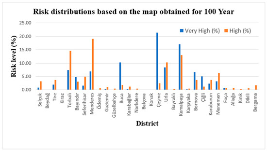 Flood hazard and vulnerability zones were delineated after reclassifying them into five zones: ‘very low,’ ‘low,’ ‘moderate,’ ‘high,’ and ‘very high’. Flood hazard zones cover the following areas: ‘very low’ 18.31%; ‘low’ 32.66%; ‘moderate’24.78%; ‘high’ 18.10%; and ‘very high’ 6.15% (Figure 5). From Figure 5, the flood hazard areas categorized as “very high” and “high” are concentrated in the central parts of the city and in the Çeşme district located in the west of the city. For vulnerability, the areas with ‘very low,’ ‘low,’ ‘moderate,’ ‘high,’ and ‘very high’ risk of cover, respectively, constituted 8.41, 23.30, 31.34, 22.49, and 14.46% of the İzmir city (Figure 6). It was found that many districts in the study area, including Menemen, Kemalpaşa, Buca, and Menderes, were located in these vulnerable areas. A flood risk map was created by combining the vulnerability and hazard maps [108]. Therefore, in order to perform a comprehensive flood risk assessment within the scope of the study, the Weighted overlay analysis was repeated by assigning equal weights to the vulnerability and hazard criteria, resulting in the generation of the flood risk map (Figure 7).