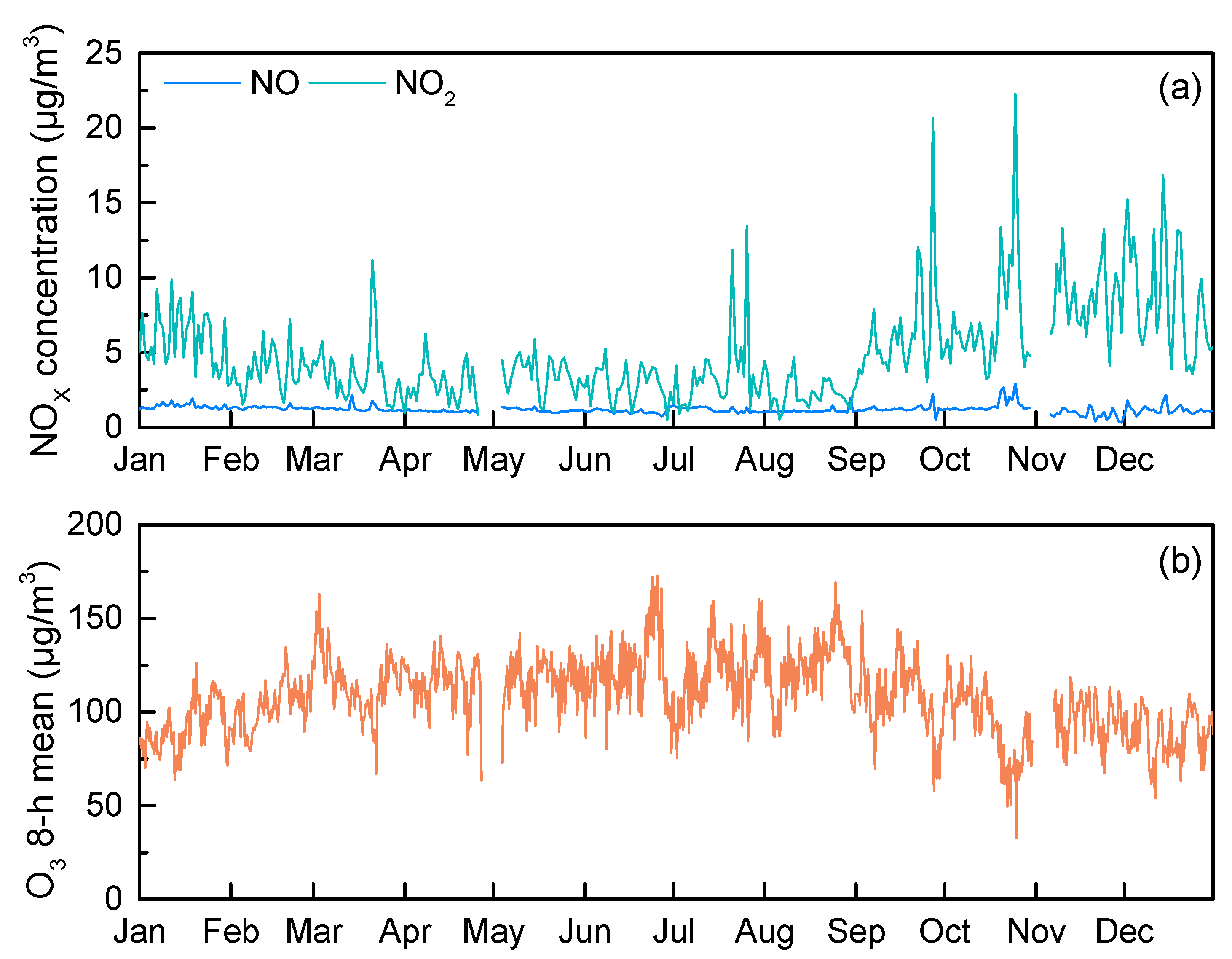 - Jiang, Z.; Tang, M.-X.; He, L.; Li, J.-H.; Hong, Y.; He, L.-Y.; Huang, X.-F. Unveiling the HONO Offsetting Effect: Rethinking NOx Emission Controls during Urban Ozone Pollution Episodes. Environ. Sci. Technol. 2025, 59, 22050–22059. [Google Scholar] [CrossRef]