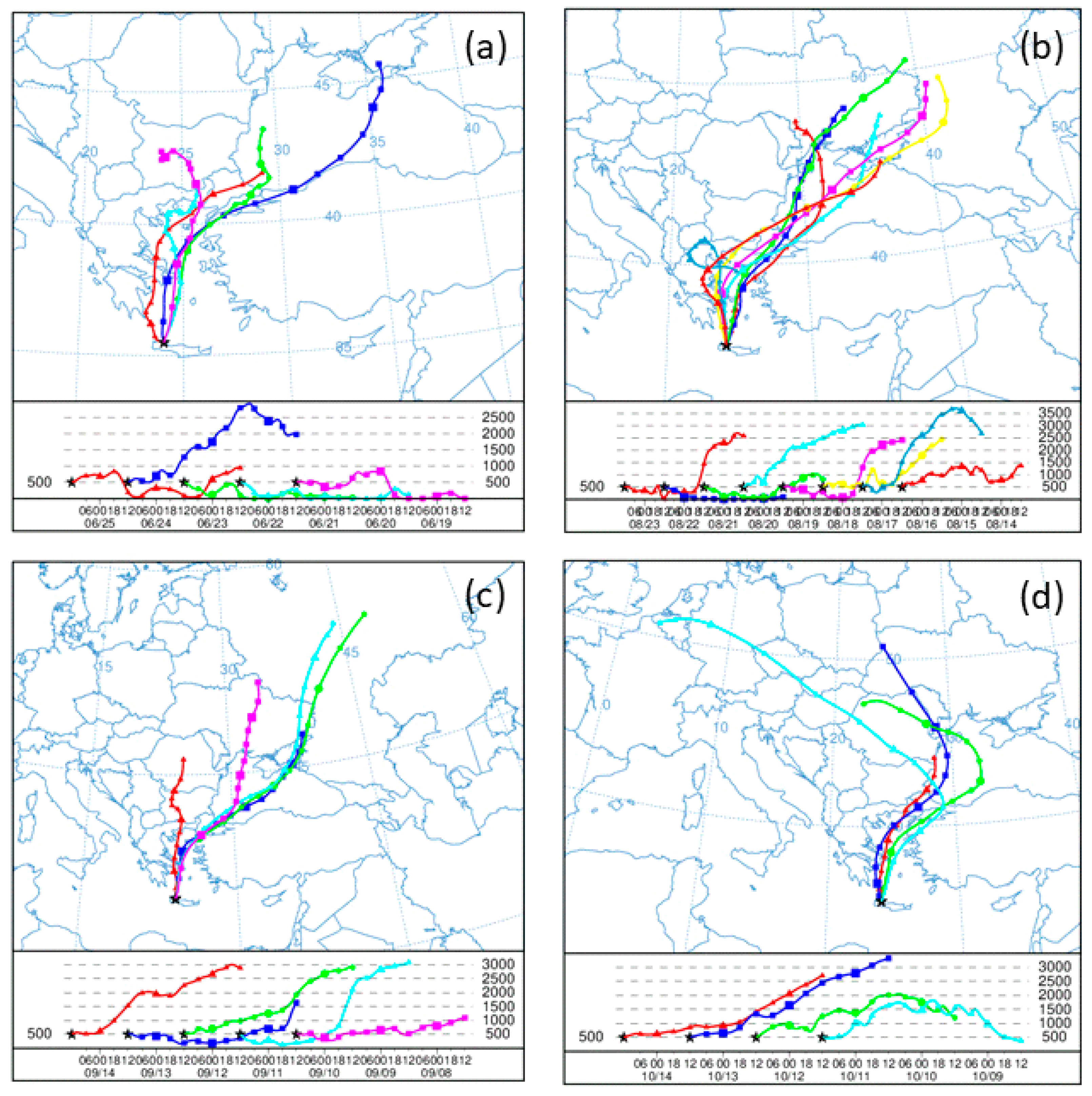 - Kalabokas, P.; Hjorth, J.; Foret, G.; Dufour, G.; Eremenko, M.; Siour, G.; Cuesta, J.; Beekmann, M. An investigation on the origin of regional springtime ozone episodes in the western Mediterranean. Atmos. Chem. Phys. 2017, 17, 3905–3928. [Google Scholar] [CrossRef]