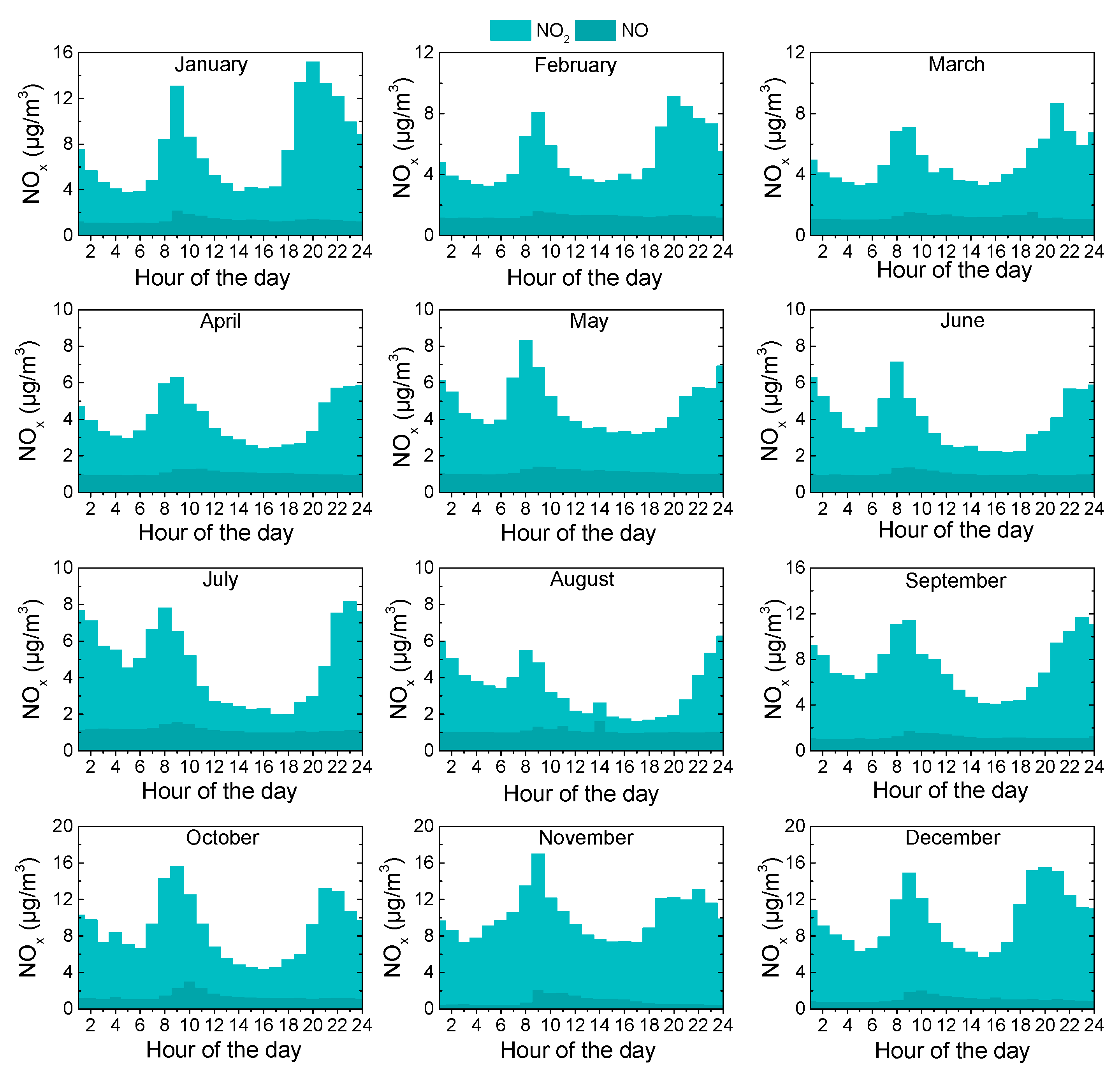 - Ravina, M.; Caramitti, G.; Panepinto, D.; Zanetti, M. Air quality and photochemical reactions: Analysis of NOx and NO2 concentrations in the urban area of Turin, Italy. Air Qual. Atmos. Health 2022, 15, 541–558. [Google Scholar] [CrossRef] [PubMed]