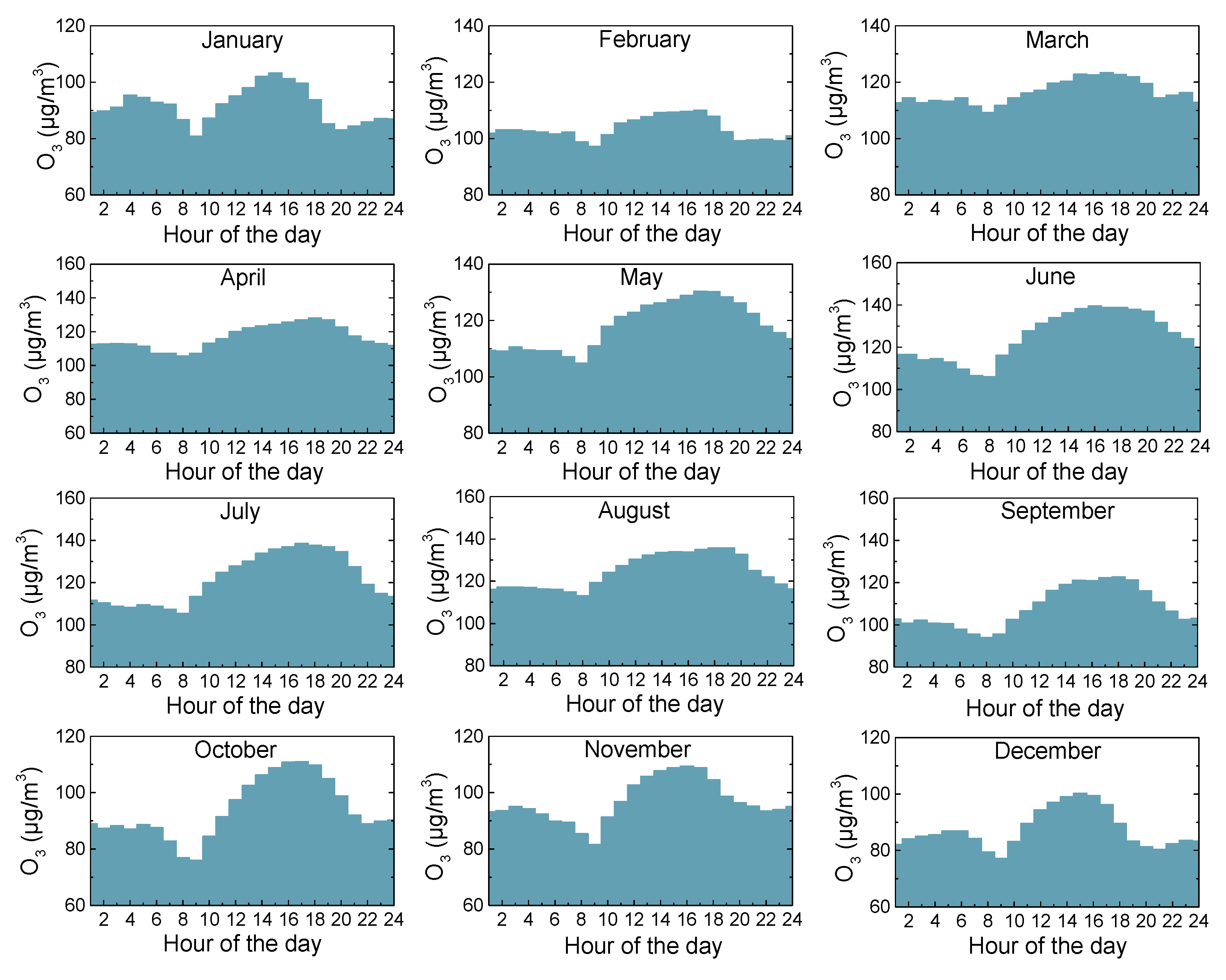 - Khoder, M.I. Diurnal, seasonal and weekdays–weekends variations of ground level ozone concentrations in an urban area in greater Cairo. Environ. Monit. Assess. 2009, 149, 349–362. [Google Scholar] [CrossRef]