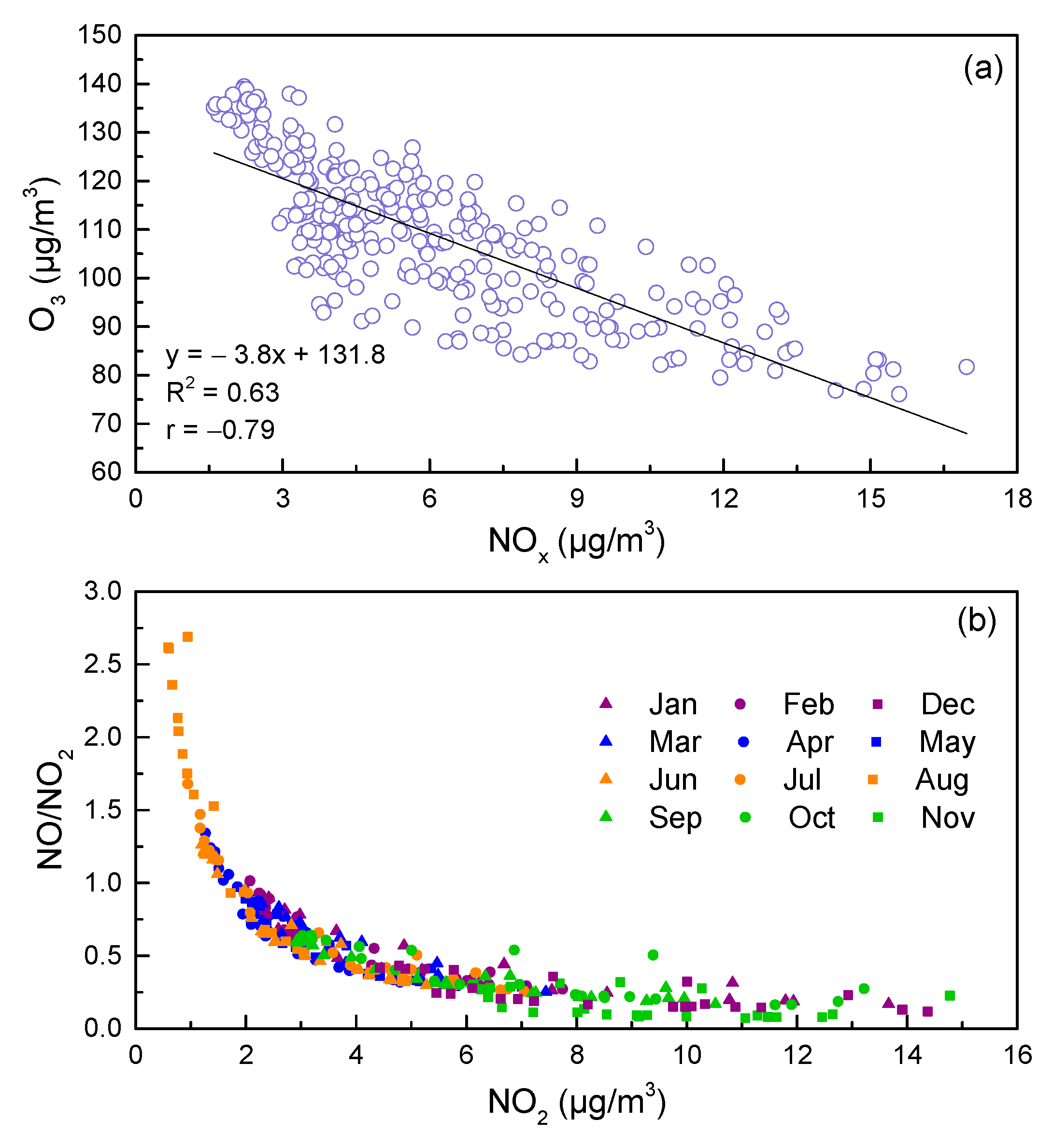 - Han, S.; Bian, H.; Feng, Y.; Liu, A.; Li, X.; Zeng, F.; Zhang, X. Analysis of the Relationship between O3, NO and NO2 in Tianjin, China. Aerosol Air Qual. Res. 2011, 11, 128–139. [Google Scholar] [CrossRef]