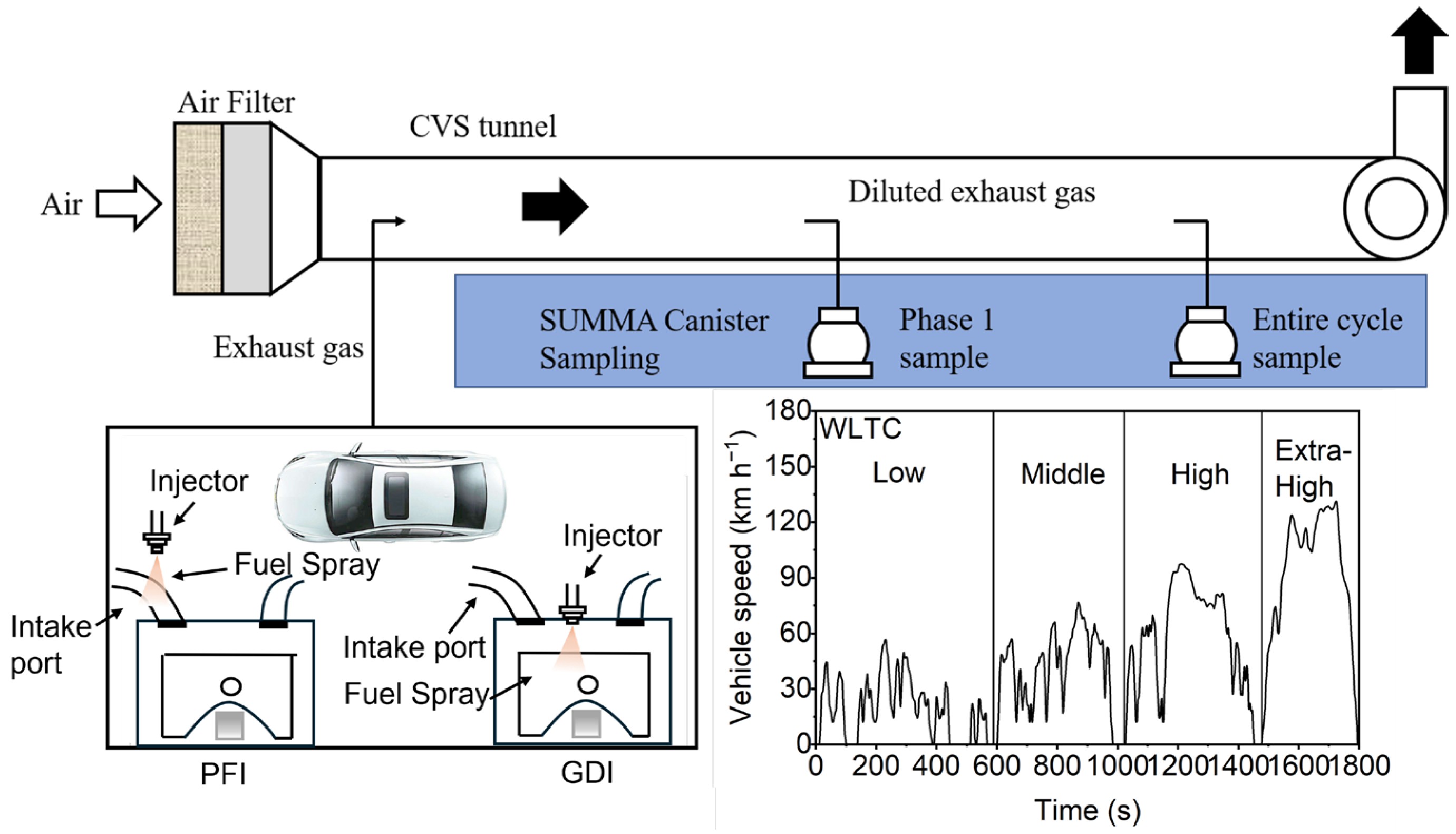 In this study, two vehicles were employed to compare the VOC emissions under dynamometer testing. One was equipped with a PFI engine and the other with a GDI engine. The PFI vehicle (model: Lavida, Volkswagen, Shanghai, China.) and GDI vehicle (model: Malibu, Chevrolet, Detroit, MI, USA.) were both manufactured in 2017, complying with the China 5 emission standard. By the end of 2018 China’s light-duty passenger vehicle (LDPV) stock had grown to the order of hundreds of millions of vehicles, and vehicles meeting the China-5 standard had become a substantial and rapidly growing component of the in-use fleet following the nationwide rollout of China-5 in 2016–2017 [