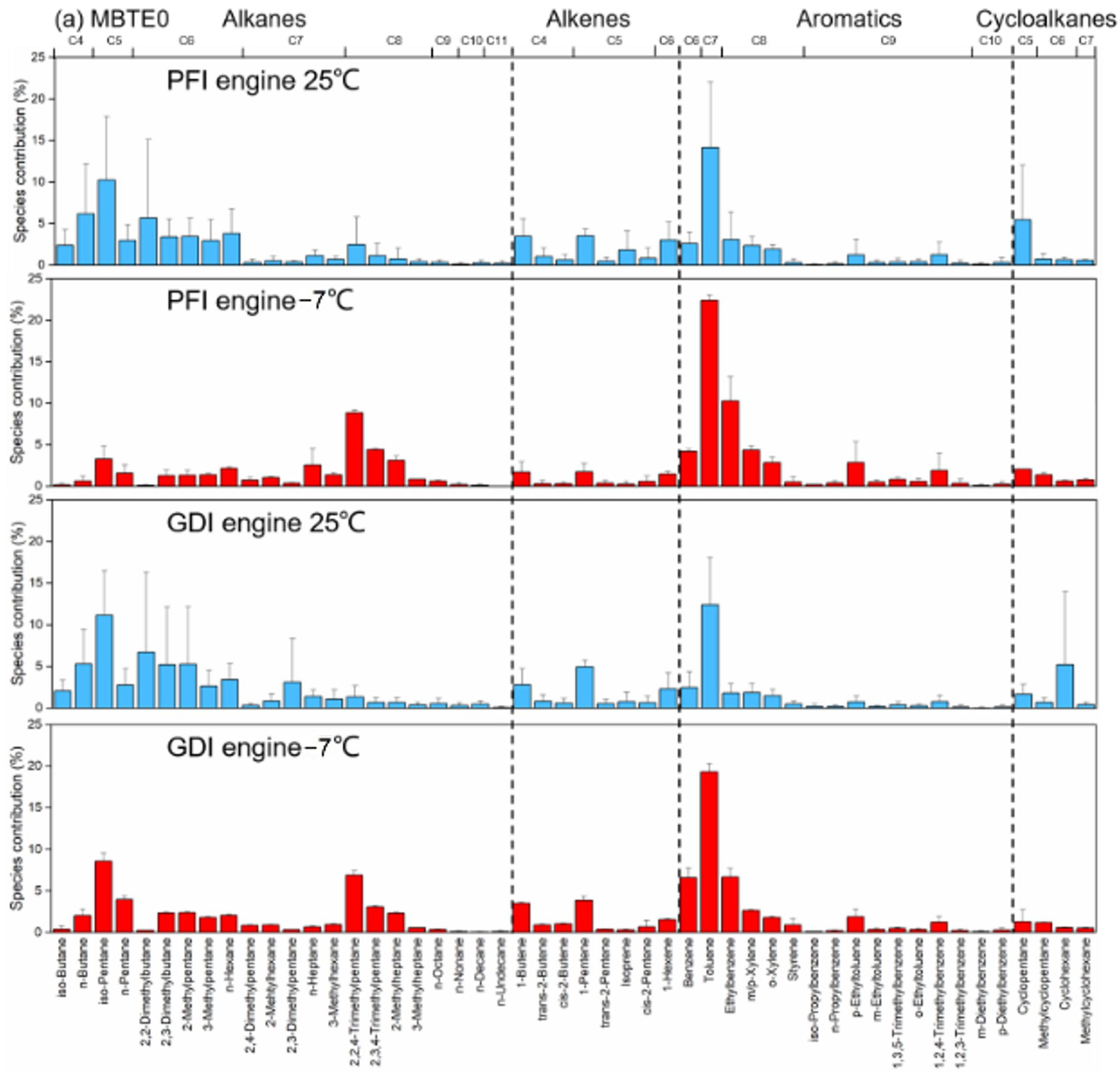 24] similarly reported that aromatic compounds exhibited the greatest relative changes between 24 °C and −7 °C. The more pronounced emission increases observed with China 6b fuel versus MTBE0 indicate that engines likely require greater fuel enrichment during cold-start at low temperatures when using China 6b. This richer combustion condition subsequently leads to elevated unburned fuel emissions.